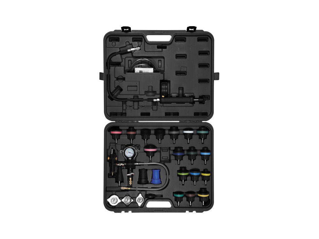 28 darabos szett radiátor szivárgások tesztelésére és gyors hűtőfolyadék cserére. Színekkel kódolt kupakok segítik a megfelelő tesztkupak kiválasztását. A teszter autószervizekhez, diagnostikai állomásokhoz stb. lett tervezve.