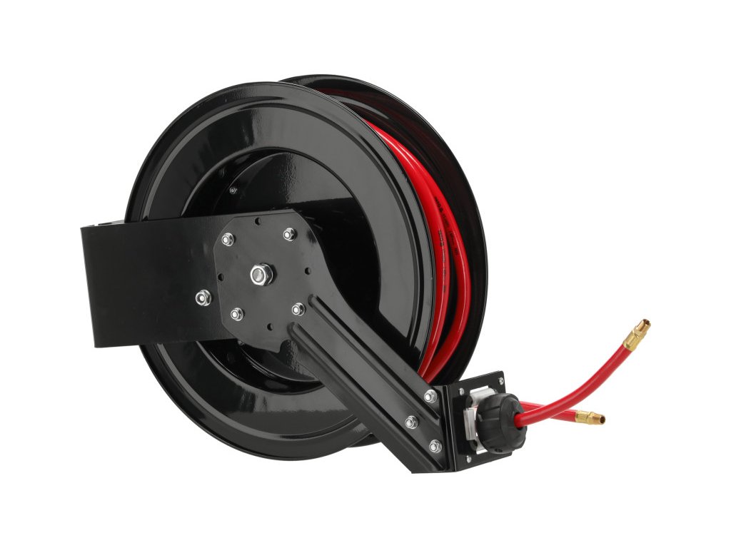 Pneumatikus szerszámok tápellátására szolgáló cső, automatikus feltekercselőn. A rugalmas cső ellenáll a magas és alacsony hőmérsékleteknek, nyújtásnak és agresszív vegyszereknek. A tekercs könnyen felszerelhető egy munkaasztalra vagy falra.