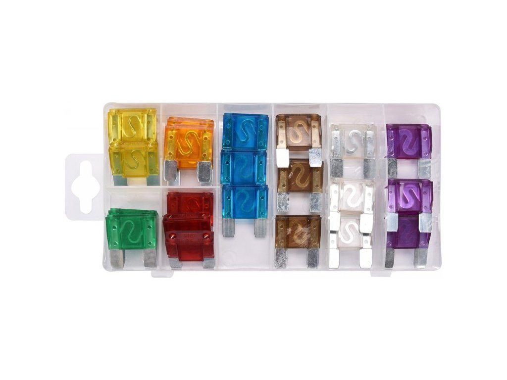 Autók elektromos rendszereinek védelmére szolgáló lapos biztosíték készletek, melyek megóvják azokat a túl nagy áram okozta károsodástól. Kompresszorokhoz, elektromos szivattyúkhoz, egyenirányítókhoz, aljzatelosztókhoz és másokhoz használhatóak. Kézreálló dobozokban csomagolva.