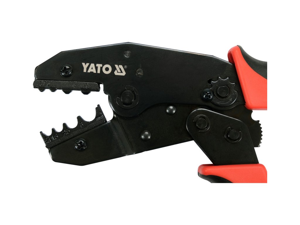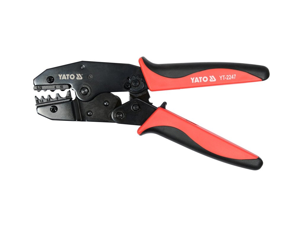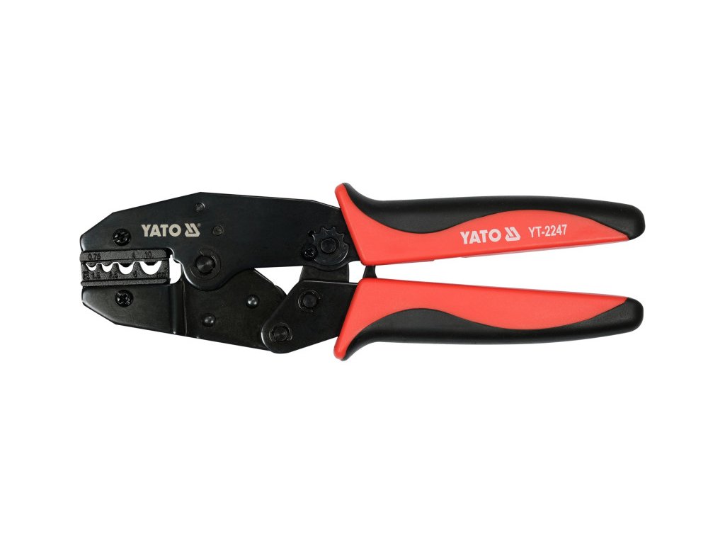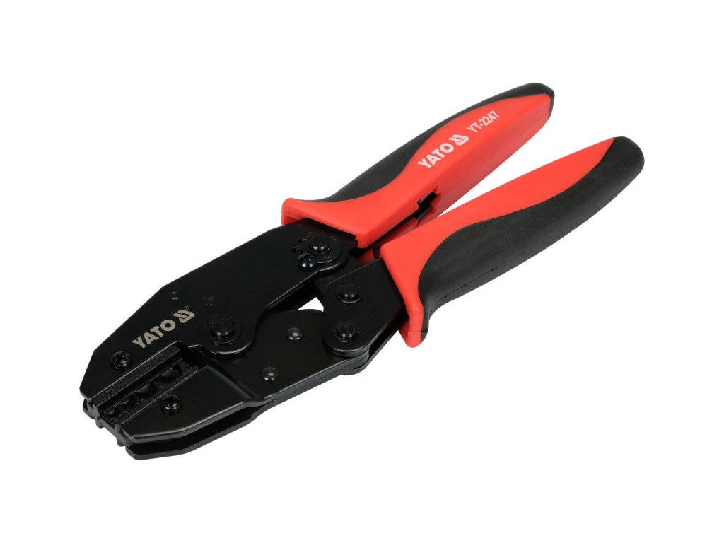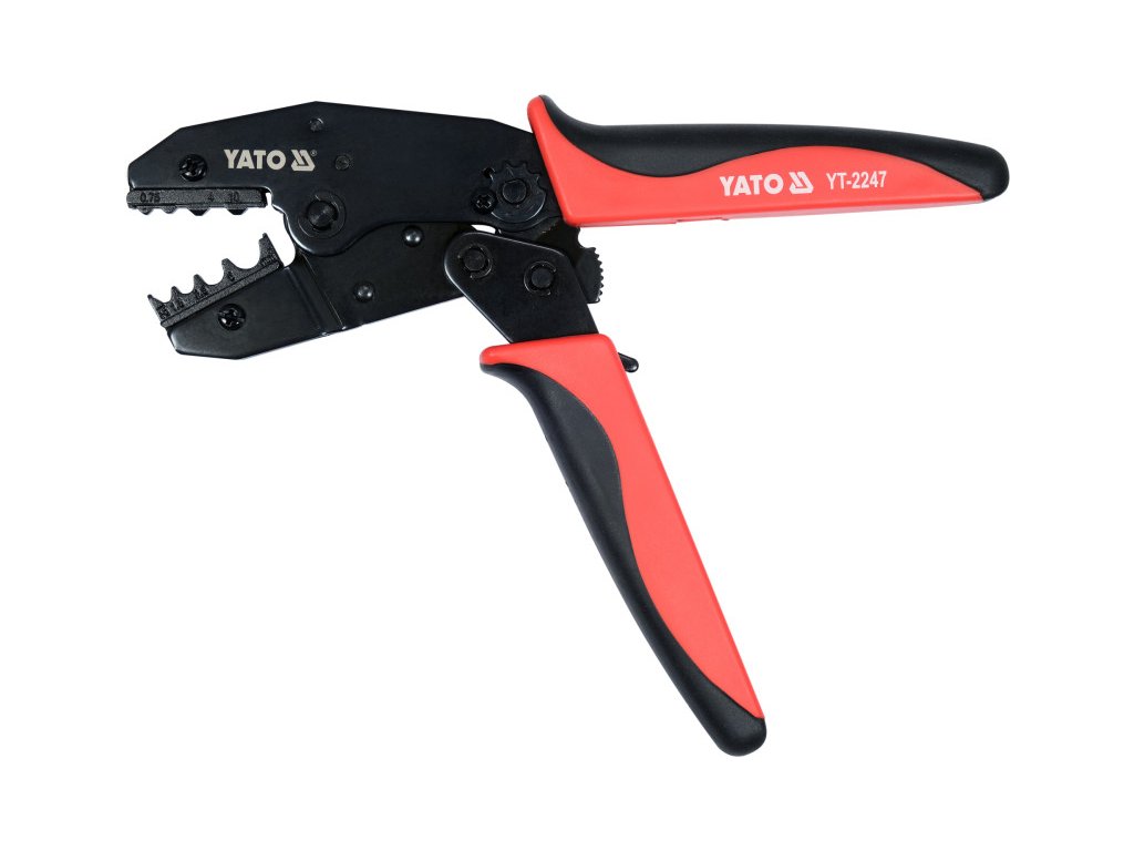 A YT-2247 csipesz, melynek feladata a nyomócsatlakozók összenyomása, fekete felülettel rendelkezik a korrózió elleni védelem érdekében, és műanyag markolattal. A racsnis mechanizmus gyors és precíz szorítást tesz lehetővé, túlzott erőkifejtés nélkül.