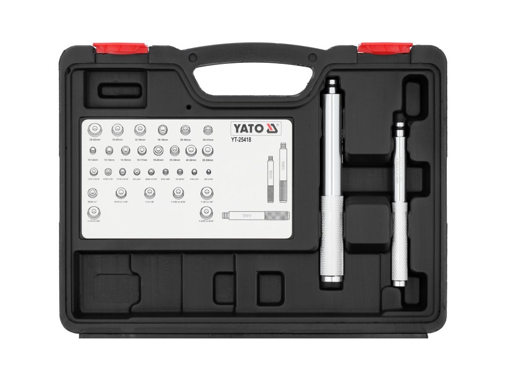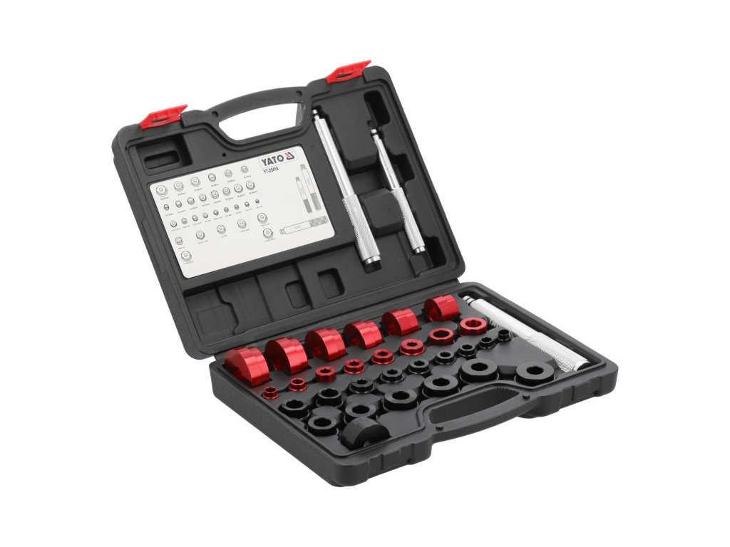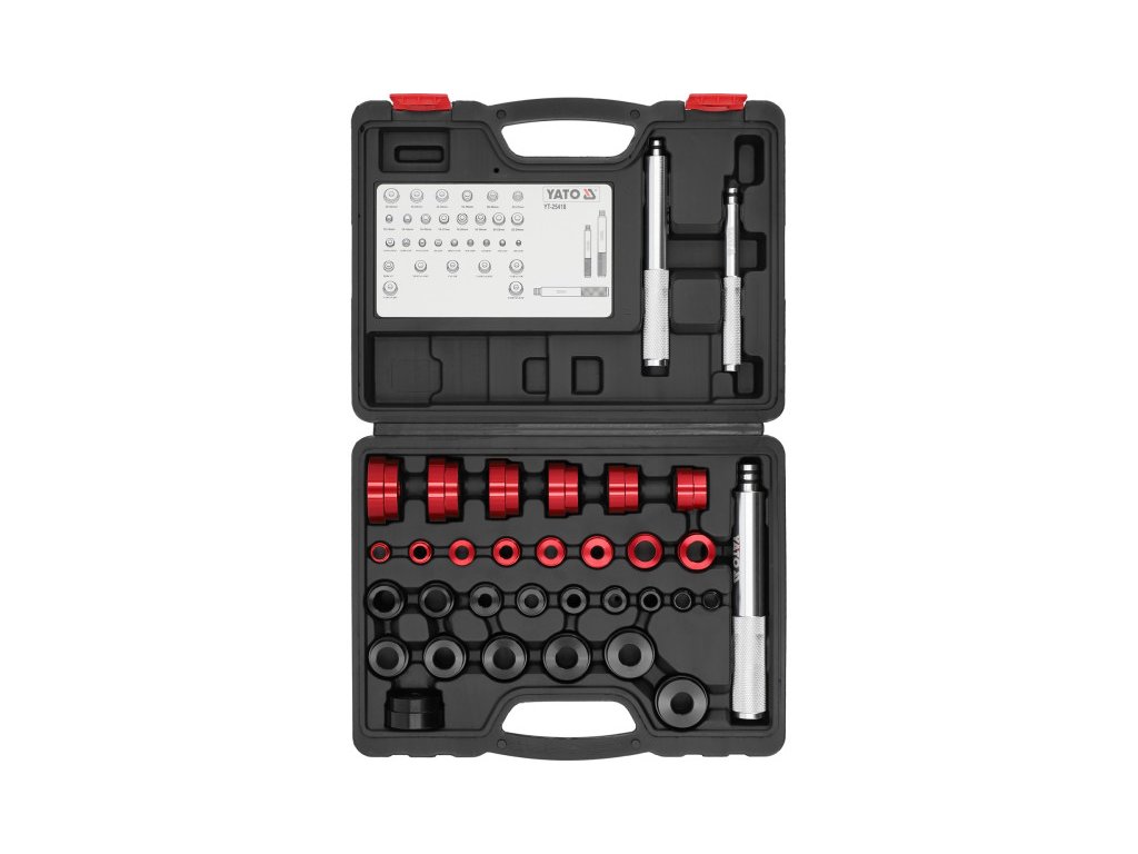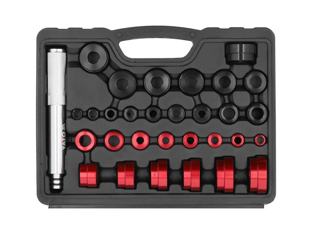 33 darabos készlet, mely csapágyak és tömítések beültetésére szolgál. Hüvelykes és metrikus adaptereket tartalmaz.