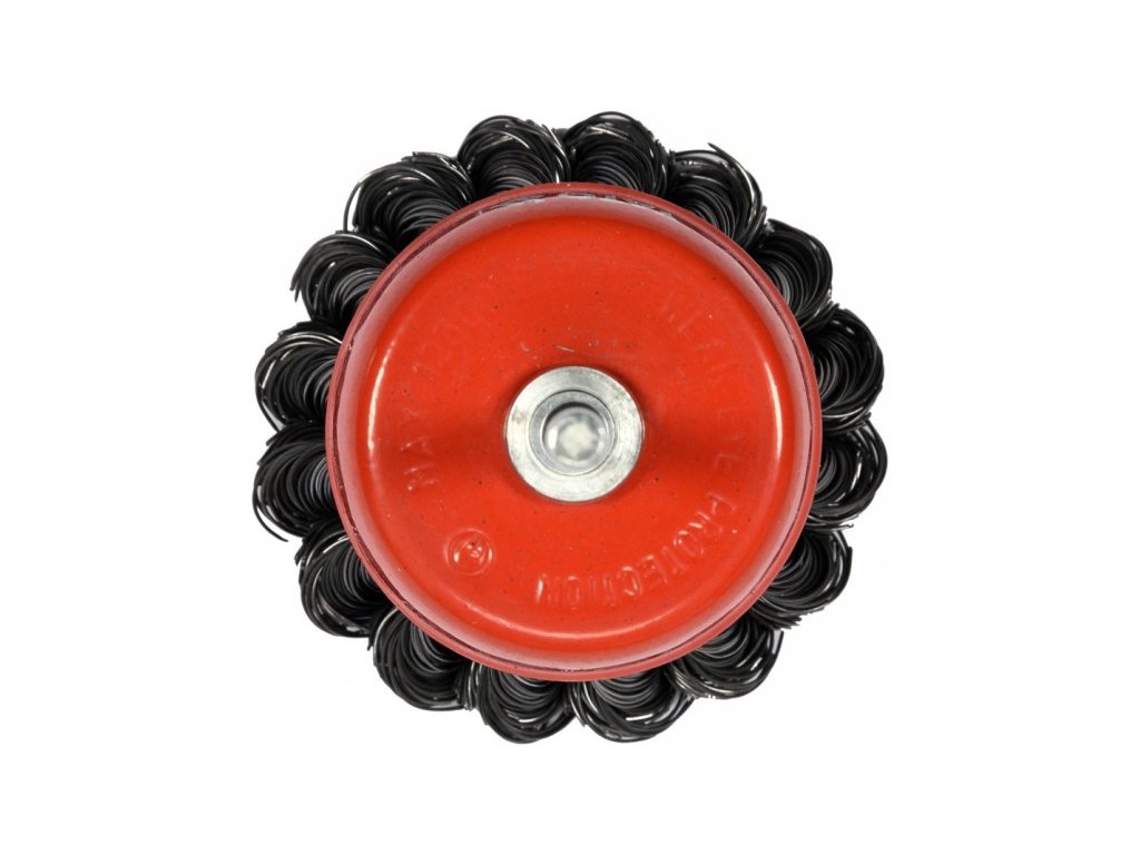 Forgácsolókefe, melyet fémfelületek tisztítására és polírozására, festékbevonatok, valamint rozsda eltávolítására és szerszámtisztításra terveztek, csiszológép használatával.
