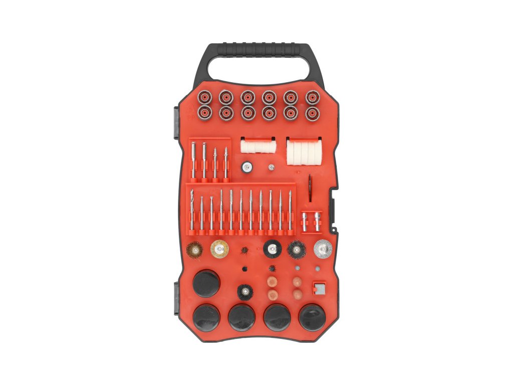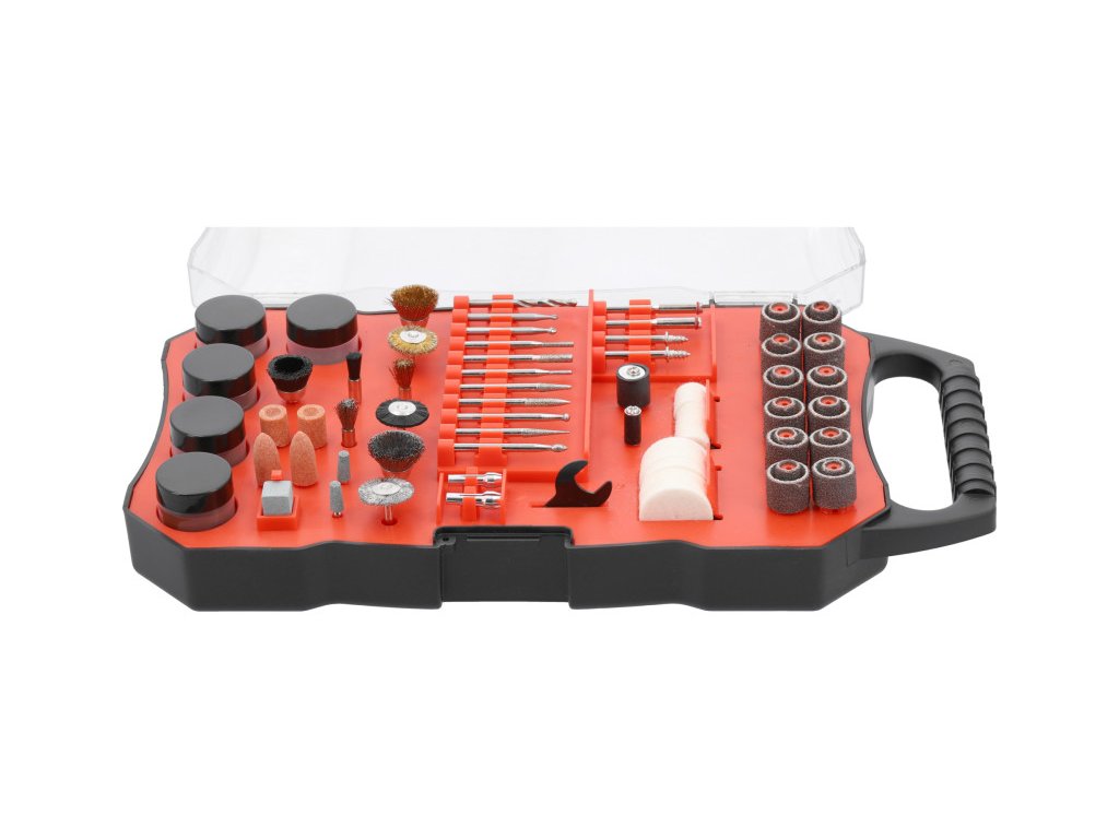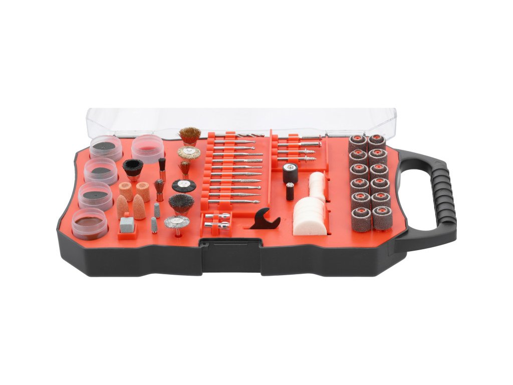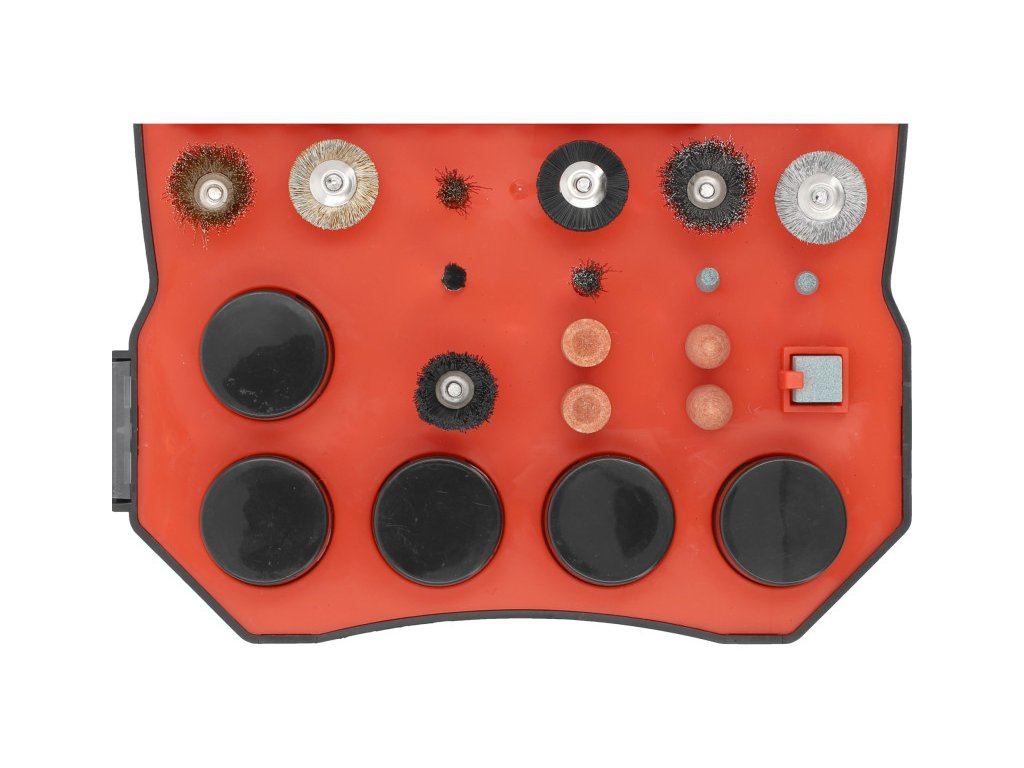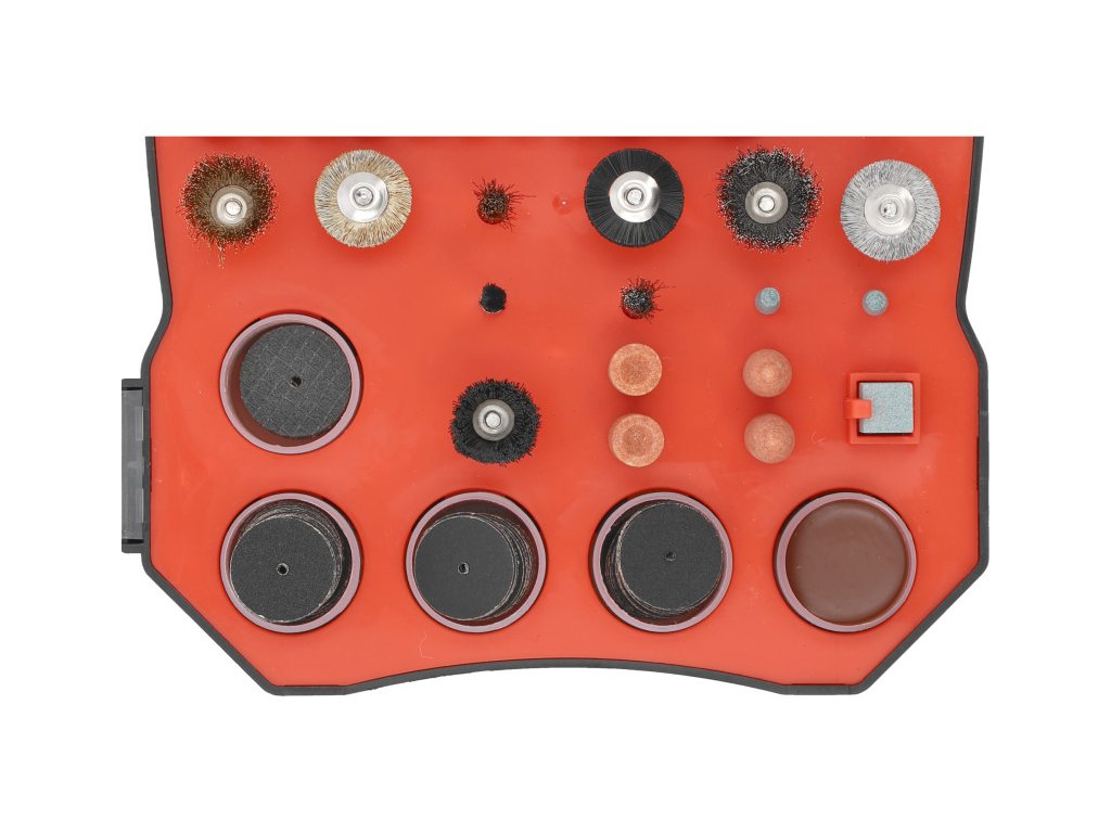 Kompletná súprava na čo najlepšie využitie vašich minibrúsok 201 vysokokvalitného príslušenstva vrátane kotúčov, diamantových vrtákov, fréz a kief, ktoré vám umožnia vykonávať širokú škálu prác od rezania cez brúsenie až po leštenie a vŕtanie, presne a. efektívny brúsny kotúč o 3,2 mm so stopkou: 6 ks diamantových vrtákov o 3,2 mm: 8 ks kolíkov na plstené kotúče o 3,2 mm: 2 ks oceľové kefy o 3,2 mm: 3 ks nylonové kefy o 3,2 mm: 3 ks mosadzné drôtené kefy. , o 3,2 mm: 3 ks brúsky o 3,2 mm: 2 tŕne o pre kotúče 3,2 mm: 2 frézy o 3,2 mm: 2 vrtáky o 3,2 mm: 1 brúsny pás 12,7 x 12,7 mm: 12 brúsnych pásov 6, 3 x 12,7 mm : 12 klieštin o 2,3, o 3,2 mm: 2 brúsky: 1 brúsny papier: 40 leštiaca pasta: 1 kotúč zo sklenených vlákien: 10 plsť 25 x 6,3 mm: 5 plsť 12,7 x 6,3 mm: 5 ks kľúč: 1 ks