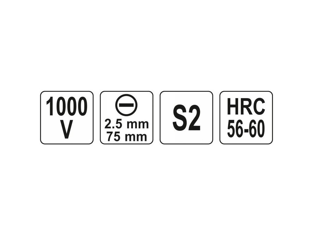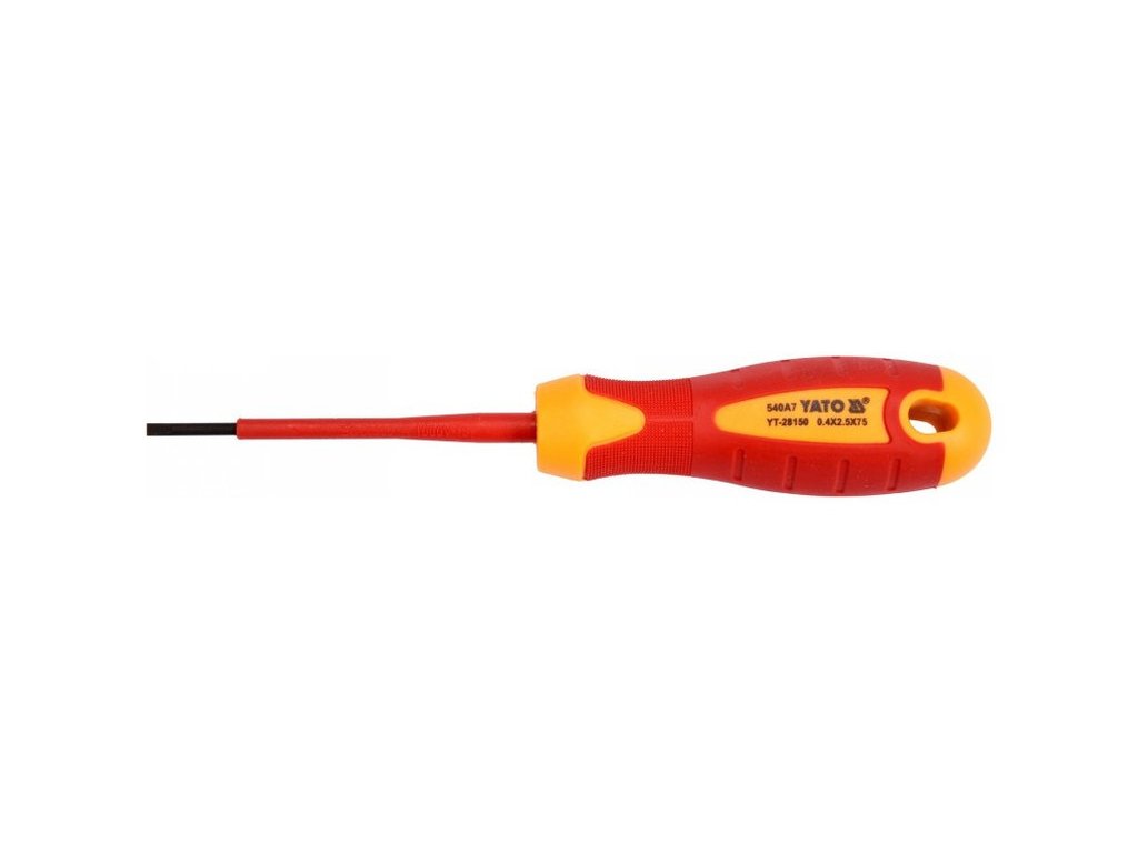 Laposfejű csavarhúzó YT-28150 VDE szigeteléssel, strapabíró S2 acélból készült, HRC 56-60 keménységgel.