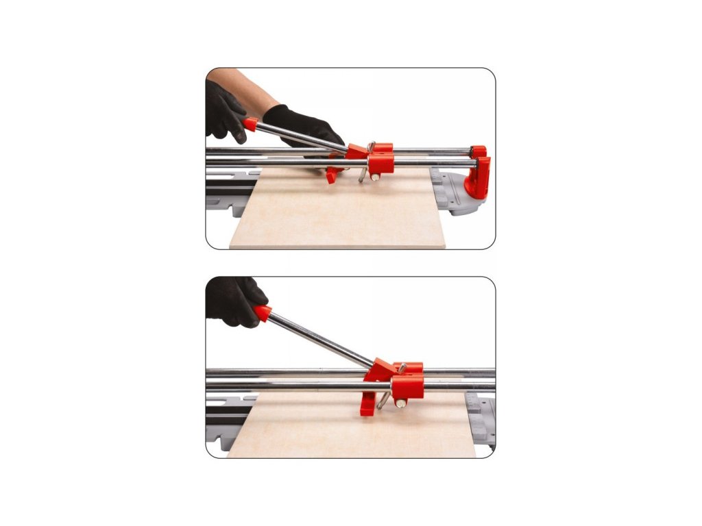 Az alap nyomás alatt öntött alumíniumból készült, két mozgatható tartóval, nagyobb csempék támogatására és fém, mozgatható szögletes konzollal. A csapágyazott darabolóegység stabil acél vezetőkön van felszerelve, amelyek 16 mm átmérőjű csőből készültek. Vágókés-kör fi 8 mm, állandóan felszerelve egy fi 10 x 82 mm-es tengelyre. A munkafelületen két technikai mikrogumi csík van felragasztva, ami megkönnyíti a csempe törését. Acél fi 15 mm darabolókar, amely szintén a kés pozíciójának blokkolását is szolgálja.