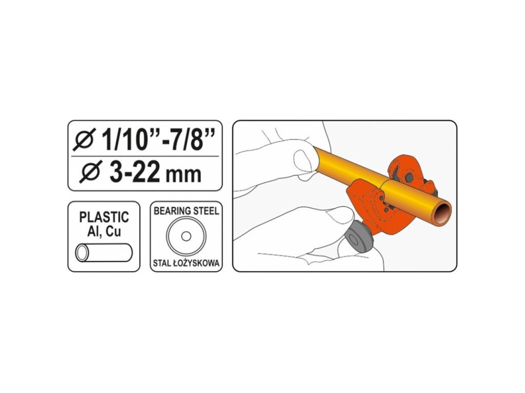 Csővágó szerszám 3-22mm méretű csövek vágásához. 2 útmutató görgővel rendelkezik. A vágókerék csapágyacélból készült, mérete 16*6mm