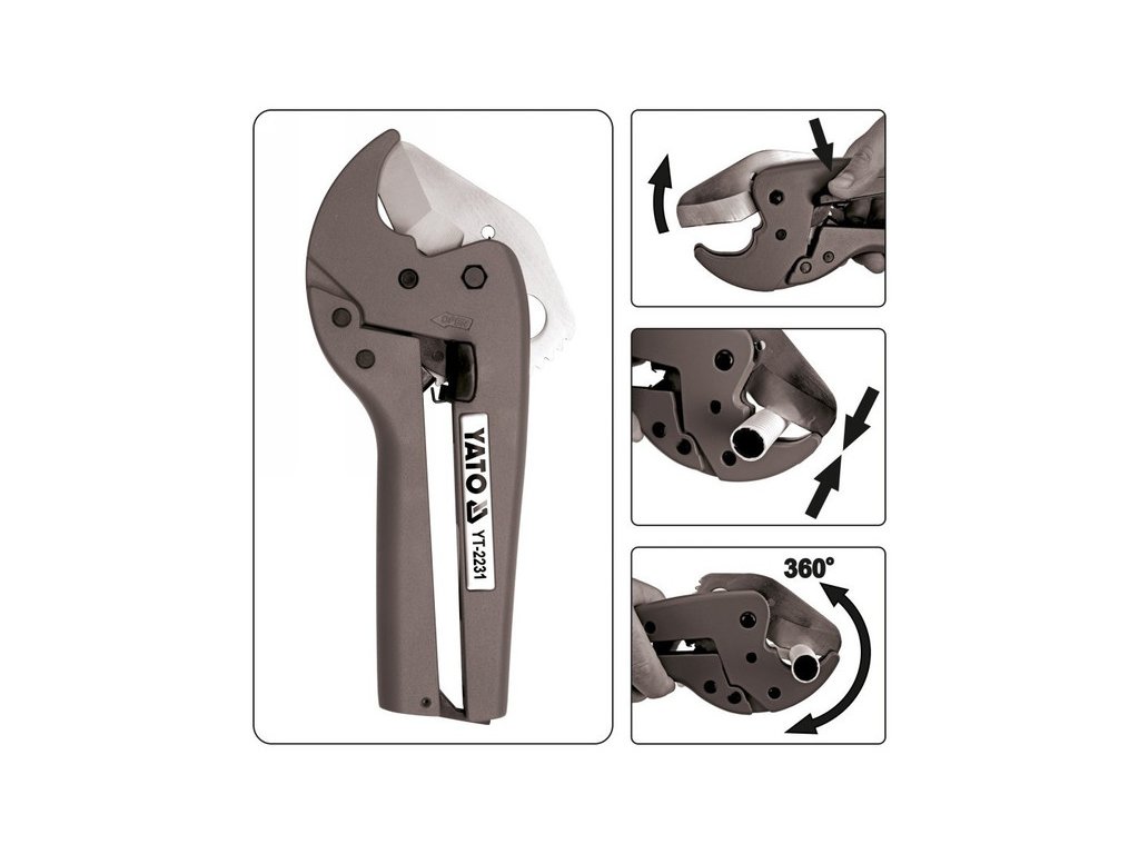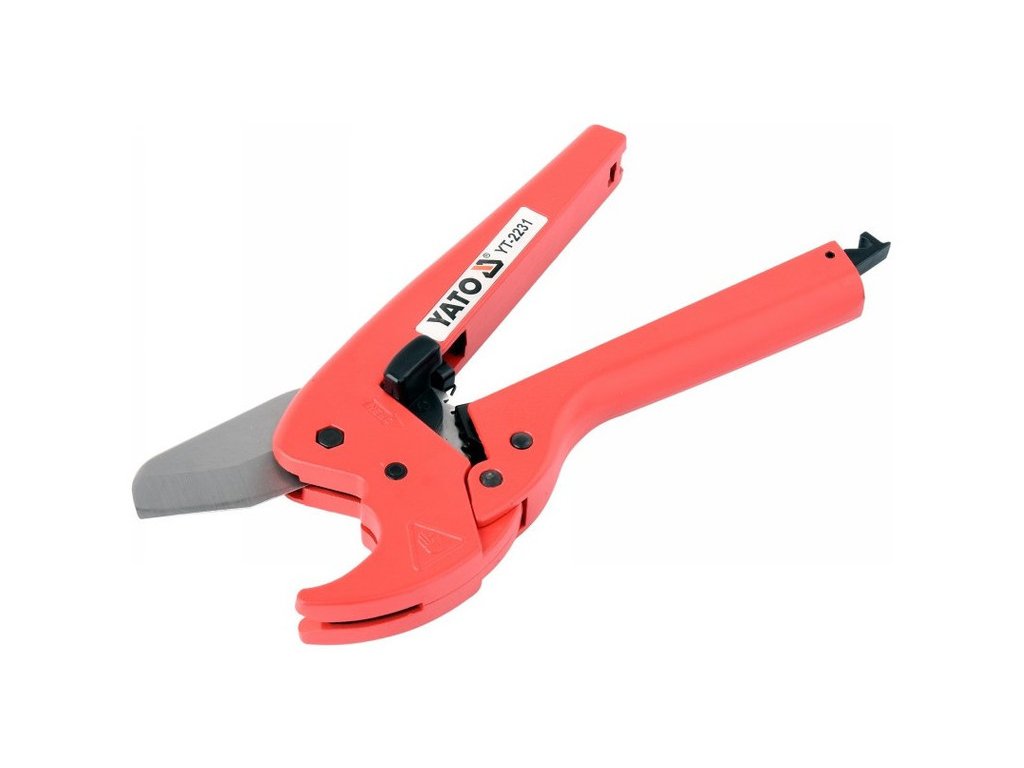 Professzionális olló csigahajtásos mechanizmussal, melyet műanyag csövek hatékony vágására terveztek akár 42 mm átmérőig.