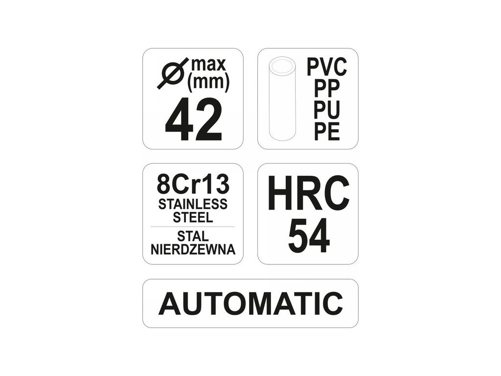• o 42 mm • nerezová čeľusť • pre PVC-PU-PP-PE rúrky
