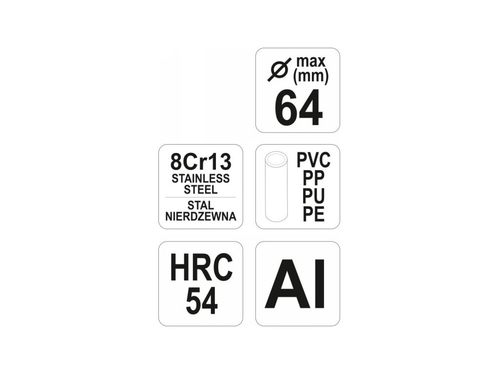 - A 8cr13 rozsdamentes acélból készült pengének 54-es HRC keménységű és racsnis mechanizmusa megkönnyíti és gyorsítja a vágást. A véső maximális vágási átmérője 64 mm