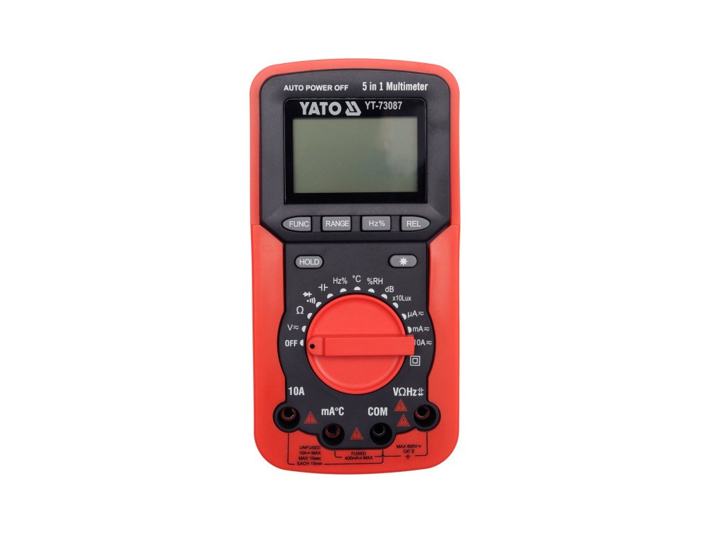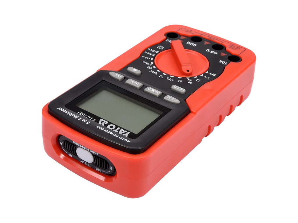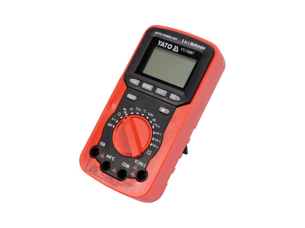 A YT-73087 univerzális mérőműszer, amely minden méréshez automatikus tartományt biztosít, olyan termék, amely öt különálló eszköz képességeit ötvözi. Az alap- és haladó szintű elektromos mérések elvégzésén túl a multiméter képes a levegő páratartalmának, a környezeti hőmérsékletnek és például a folyadéknak vagy kábelnek a mérőszondák segítségével történő mérésére, a decibelben mért hangintenzitásra és a luxban mért fényintenzitásra. Mindezek a funkciók lehetővé teszik, hogy nagyobb mértékben felmérjük az elektromos eszközök működésének minőségét, mint a hagyományos elektromos mérőműszerek. Megvizsgálhatjuk a villanykörte által kibocsátott fény mennyiségét, a hangrendszer hatékonyságát. Megvizsgálhatjuk továbbá, hogy a körülmények megfelelőek-e az elektromos eszközök működéséhez (páratartalom és hőmérséklet). Alapmérések váltófeszültség-mérés: A.C. 0-300V Egyenfeszültség-mérés: D.C. 0-300V ÁRAMMÉRÉS: A.C. 0-10A DC mérés: D.C. 0-10A ellenállás-mérés: 0-40mΩ diódapróba: IF 1MA, UR 1.5V Áramkör folytonosságának vizsgálata: 0-50Ω További mérések Kondenzátor kapacitás mérése: 0-100μF Frekvenciamérés: 0-200kHz Hőmérséklet mérés: -20 és 1000 ° C közötti mérések Töltési tényező: 5-95% Relatív páratartalom mérés: 30-90% Rh Hangintenzitás mérés: 35-100 dB fényintenzitás: 0-40000 lx Mérési pontosság Példa az AC feszültség mérésének pontosságának meghatározására AC. Számítások a mérési eredményhez: 235V A YT-73087 mérőműszer mérési pontossága ebben a tartományban: ± (1.0% + 5), felbontás 0.1V A mérési hiba kiszámítása Minta: (mérési eredmény x 1.0%) + 5 x Felbontás számítása: (235 x 1.0%) + 5 x 0.1 = 2.35 + 0.5 = 2.85V Az eredmény, figyelembe véve a mérési hibát a 235V jelzésre = 235 ± 2.85V* az eredmény, figyelembe véve a mérési hibát a fix feszültség mérésének jelzésére: 12V = 12 ± ± ± ± ± 0.126V Az eredmény, figyelembe véve a mérési hibát az váltóáram mérésének jelzésére: 8a = 8 ± 0.34a* A felbontás és a pontosság táblázata a megadott méréshez megtalálható a felhasználói kézikönyvben. *A & nbsp; YT-73087 & nbsp; mérőműszernek nincs TRUE RMS mérési funkciója, ezért a fenti eredmény csak a helyes szinuszos menet AC feszültség tényleges hatékony értéke. Beépített autó funkciók - a mérési tartomány automatikus beállítása. Ha ismeretlen értékeket mérünk egy manuális tartományváltóval ellátott mérőműszerrel, a méréseket a legnagyobb tartománytól kezdve kell elvégezni azon tartományig, amely a legpontosabb eredményt adja - különben kockázatot jelentünk a készülék károsodására. Azonban egy autófunkcióval rendelkező multiméter esetében elegendő egy mérést elvégezni, és a mérőműszer automatikusan megtalálja az optimális tartományt. A mérőműszer alapértelmezetten Auto Range-ben indul - manuális változtatás a mérési tartományban. Hasznos funkció, amikor sok, ismert értékű komponenst ellenőrzünk, például egy sor ellenállást. A tartomány manuális beállítása jelentősen csökkenti az ilyen mérések idejét FUNC - mérési mód változtatása, például AC feszültségmérésről DC-re, a diódapróba átkapcsolása a REL áramkör vizsgálatára - a funkció használata a mérés során visszaállítja a kijelzőt és a korábban megjelenített értékeket referencia szintként veszi figyelembe. A következő mérés megmutatja a mért érték és a megőrzött referencia érték közötti különbséget Hz% - a gomb beállítása a frekvencia méréséhez a gombot a töltési tényező / munkaciklus mérésére változtatja Data Hold - a jelenleg mért érték megjelenítése a kijelzőn további információk LCD kijelző, & nbsp; maximális Kijelző megjelenítése: 3999 Háttérvilágítás a kijelzőn. Hangjelzés az áramkör folytonosságának vizsgálatakor 50Ω alatt. Lehetőség a diódapróbák és az áramkör folytonosságának külön-külön történő bekapcsolására a mérőszonda készletben, hőmérsékletmérő szonda és túlterhelés elleni védőburkolat műanyag ház + úgynevezett Holster, azaz gumi ház, amely védi a mérőműszert a mechanikai sérülésektől, a mérőműszer automatikus kikapcsolása alacsony akkumulátorszint. Tápellátás: 9V-os elem (6F22)