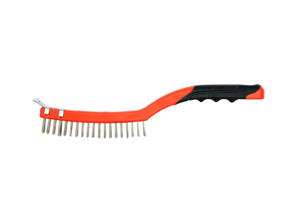 Műanyag testbe állandóan beágyazott rozsdamentes acél rugódrótból készült. A kefe profilja növeli a tisztítási hatékonyságot. Rozsdamentes acélból készült kaparóval van befejezve.