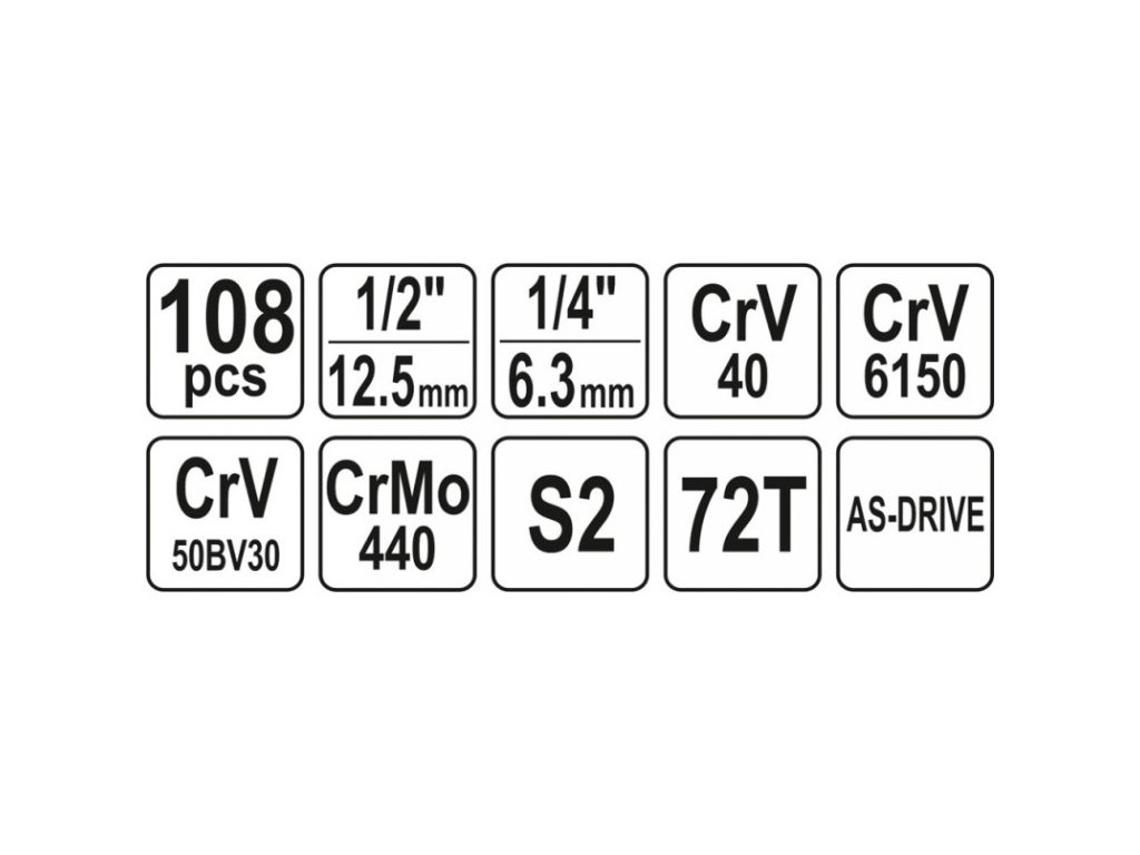 • 1/2 nástrčkový kľúč: 10-11-12-13-14-15-16-17-18-19-20-21-22-24 mm/L= 38 mm CrV 50BV30 • 1/2 nástrčkový kľúč: 27-30 -32 mm/L= 42 mm CrV 50BV30 • 1/4 Nástrčkový kľúč: 4-4,5-5-5,5-6-7-8-9-10-1 1-12-13-14 mm/L= 25 mm) CrV 50BV30 • 1/2 výstelky: 14-15-17-19-22 mm/L= 76 mm CrV 50BV30 • 1/4 výstelky: 6-7-8-9-10-11-12-13 mm /L= 50 mm CrV 50BV30 • 1/2 výstuž: E10-E11-E12-E14-E16-E18-E20-E24 CrV 50BV30 • 1/4 výstuž: E4-E5-E6-E7-E8/Cr30 •50 16 bit: 8-10-12 mm/L= 30 mm AISI S2 • 5/16 bit: PH3-PH4/L= 30 mm AISI S2 • 5/16 bit: PZ3-PZ4/L= 30 mm AISI S2 • 5 /16 bit: T40-T45-T50-T55-T60/L= 30 mm AISI S2 • 5/16 bit: 7-8-10-12-14 mmL= 30 mm AISI S2 • 1/4 bit: 4-5 ,5, 6,5 mm/L= 37 mm AISI S2 CrV 6150 • 1/4 bit: PH1-PH2/L= 37 mm AISI S2 CrV 6150 • 1/4 bit: PZ1-PZ2/L= 37 mm AISI S2 CrV 6150 • 1/4 bit: T8-T10-T15-T20-T25-T27-T30/L= 37 mm AISI S2 CrV 6150 • 1/4 bit: 3-4-5-6 mm/L= 37 mm AISI S2 CrV 6150 • hajtószár: 72T CrV 6140