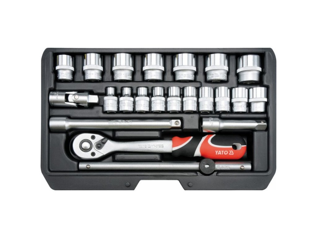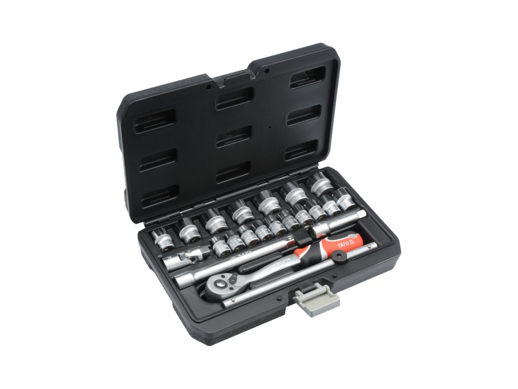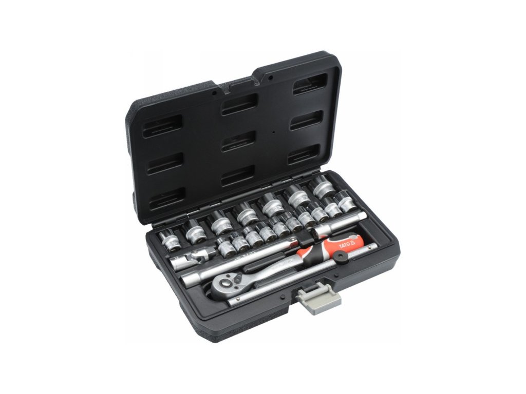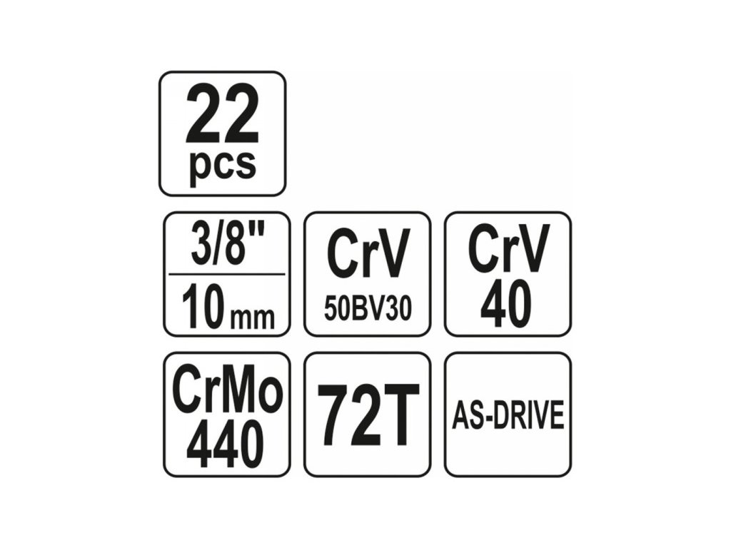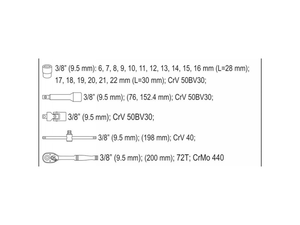 Professzionális szerszámkészlet, amelyet az autó- és mechanikai szervizek specializált igényeihez fejlesztettek ki. A fogaskerekes kulcsok és a melléklet hajtása tartós, szerszámvánádium acélból készült CRV 50BV3. A mellékletek az AS-Drive rendszerrel vannak felszerelve, ami 25%-kal növeli a maximális momentet, teljes védelemmel a sapka vágója számára, a két tónusú felületkikészítéssel rendelkező melléklet. A mellékleteket mátrix módszerrel készítették, és a keményítési folyamat előtt pontos illesztésekkel és ellenőrző eszközökkel kalibrálták. A készlet lehetővé teszi a nagyon nagy terhelést és precíziót igénylő munkát, lehetővé teszi számos szerviztevékenység elvégzését, amelyek az eltérő névleges méretű menetes csatlakozások le- és felszerelésével kapcsolatosak. A racsni háromszög alakú fogantyúval és 72 foggal (munka ugrás 5 fok) rendelkezik. 3/8" sapkák: 6; 7; 8; 9; 10; 11; 12; 14; 15; 16 mm, L = 28 mm; 17; 18; 20; 20; 21; 22 mm, L = 30 mm 3/8" hosszabbítók: 75 mm; 150 mm racsni 3/8": 200 mm; 72t csúszó gomb 3/8": 200 mm Cardana 3/8" csukló "bőrönd