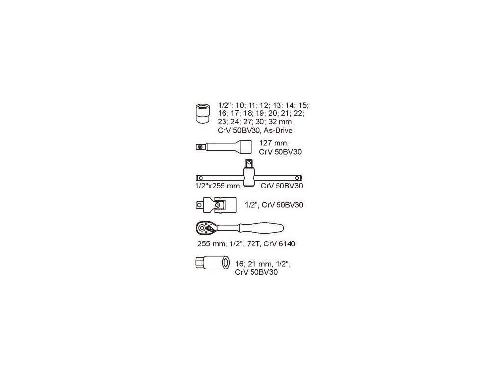 • 1/2 nástrčný kľúč: 10-11-12-13-14-15-16-17-18-19-20-21-22-23-24-27-30-32 mm CrV 50BV30 • hnací hriadeľ: 72T 1/2/255mm CrV 6140