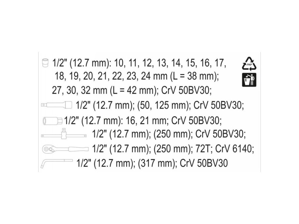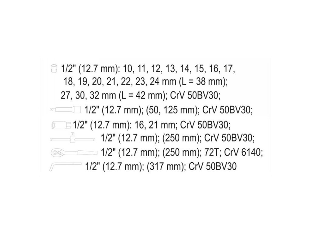 • 1/2: 10-11-12-13-14-15-16-17-18-19-20-21-22-23-24 mm/L= 38 mm CrV 50BV30 • 1/2: 27 -30-32 mm/L= 42 mm CrV 50BV30 • hajtószár: 72T 1/2/250 mm CrV 6140