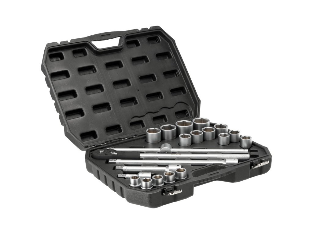 21-dielna sada, v praktickom kufríku, veľkosť balenia držiak na číslo čítačky: 3/4 (19,0 mm), materiál: CrV 50BV30, počet zubov: 24, obsah sady: zásuvky 3/4 (19,0 mm ): 19, 21, 22, 23 , 24, 26, 27, 29, 30, 32, 35, 36, 38, 41, 46, 50 mm3/4 predĺženia (19,0 mm): L=100, 200, 400 mm T hnacia tyč 3/4 (19,0 mm): L=450 mm račňový hnací hriadeľ 3/4 (19,0 mm): L=500 mm; 24 T