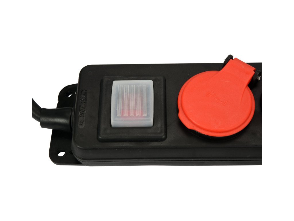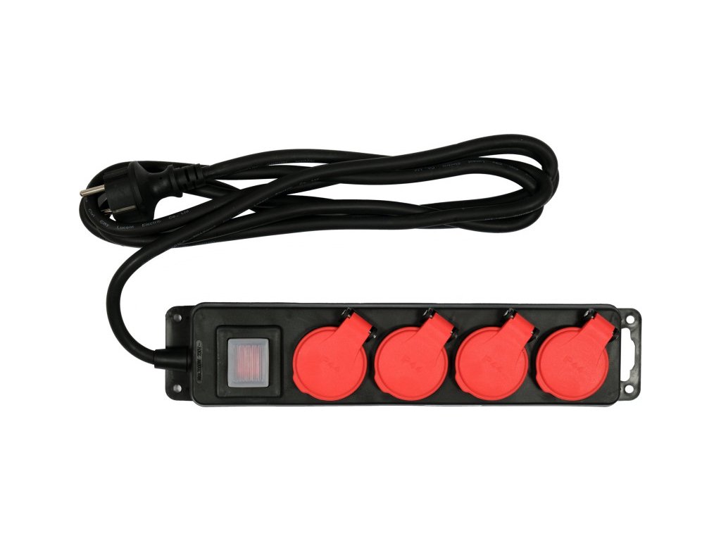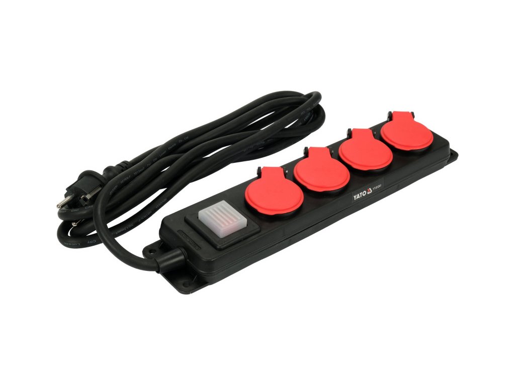 Hosszabbító kábel YT-81241, négy földelt aljzattal. A vastag és erős kábel neoprén gumi bevonattal teszi a hosszabbítót alkalmas bel- és kültéri használatra, mint például a garázsban, építkezésen, kertben vagy gyári udvarok előtt. A szivárgásmentes és tartós ház és az aljzatokat védő fedél biztosítja a víz- és porálló kialakítást, míg a beépített függesztőlyukak lehetővé teszik a hosszabbító falra szerelését.