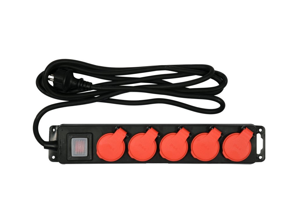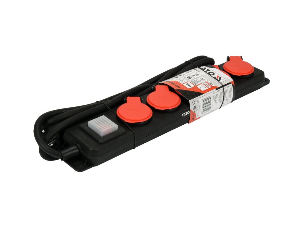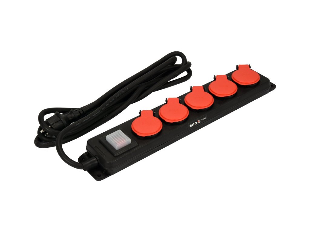 Hosszabbító YT-81240 csík formájában, öt földelt aljzattal. A vastag és erős kábel neoprén gumi burkolatban alkalmassá teszi a hosszabbítót beltéri és kültéri használatra egyaránt, például garázsban, építkezésen, kertben vagy gyárudvarokon. A szivárgásmentes és tartós ház és a felnyitható aljzatfedelek biztosítják a fröccsenő víz és por elleni védelmet, míg a kijelölt rögzítőlyukak lehetővé teszik a hosszabbító felfüggesztését, például egy falon.