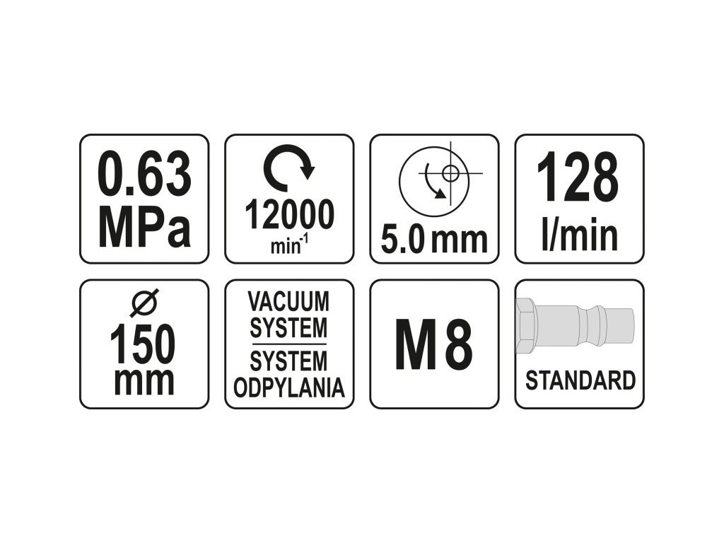 Professzionális excentrikus csiszoló sűrített levegővel működtetve. A lemezekre közvetlenül felhordott csiszolóanyagoknak köszönhetően lehetővé teszi különböző anyagok csiszolását és polírozását. Autószerelő műhelyekben és az iparban is használatos.