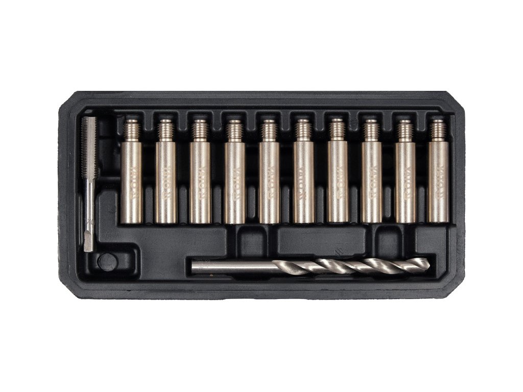 A féknyereg javító készlet profi eszköz tönkrement menetek javításához egy féknyeregben. A csomag tartalmaz egy fúrót és dedikált menetfúrót - és 10 nagyobb méretű vezetőt féknyergekhez. A javítás a sérült elem felújítását és újramenetelését jelenti - és egy új - nagyobb méretű vezetőt helyezünk fel. Mindez egy praktikus csomagolásban.