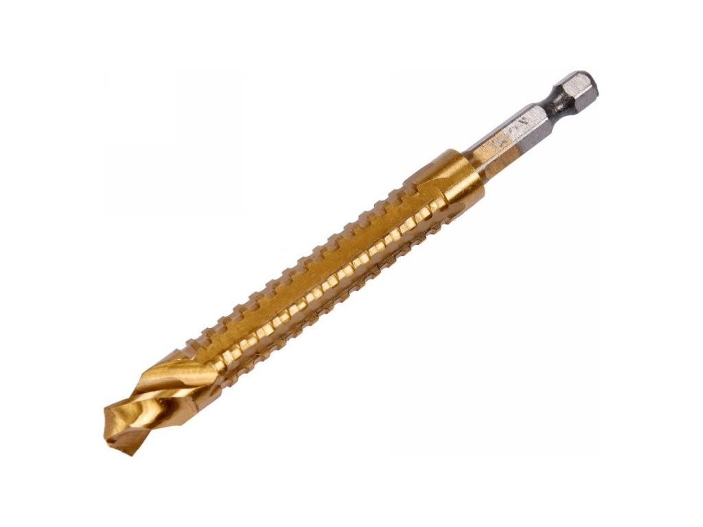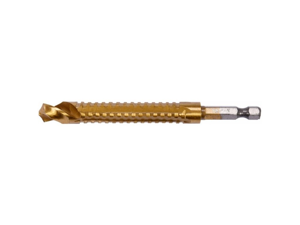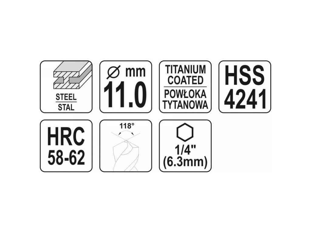 11 mm-es Yato YT-44829 fém marófúró. A marófúró minőségi HSS 4241 magas sebességű, titánnal bevont acélból készült. Professzionális, ipari felhasználásra szánt. A STAL HSS többször gyorsabb fúrást tesz lehetővé rozsdamentes, saválló és szerkezeti acélban. A "Split Point" keresztpenge 118°-os csúcsszögű, előzetes pontozás nélküli fúrást tesz lehetővé, nagy átmérőjű fúrással, tökéletes középpontosítással. Lehetővé teszik a fúrást minden irányban és bármilyen szögben, tökéletesen alkalmasak lyukak fúrására, beleértve az ajtózárat is. A csiszolt felület kiváló fúrási pontosságot biztosít. Egy darab acélból készültek, így nagyon erősek és tartósak. A kemény bevonat 58–62 HRC, titán-nitrittel bevont, ellenáll a sérüléseknek és a nyúlásnak, megőrizve a fúrási geometriát • Az alacsonyabb fúrási hőmérséklet és a gyors hőelvezetés nem okoz galvanizálás olvadását és a fúrók korrózióját • A kisebb súrlódási tényező korlátozza a forgácsokhoz és reszelékekhez való tapadást. 1/4 ″ hatszögű nyél (6,3 mm).