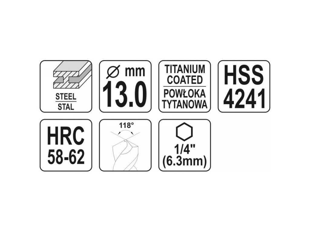 A yato YT-44831 fém marófúró. A marófúró magas minőségű, nagy sebességű HSS 4241 titán bevonatú acélból készült. Professzionális, ipari alkalmazásokra szánt. A HSS acél többször gyorsabb fúrást tesz lehetővé rozsdamentes, saválló és szerkezeti acélban. A "Split Point" keresztéles 118°-os hegyesszögű pengével előzetes jelezés nélkül is lehet fúrni, nagy fúrási átmérőknél is, tökéletes középre igazítást biztosítva. Lehetővé teszik a fúrást minden irányban és bármilyen szögben, tökéletesek lyukak fúrásához, beleértve az ajtózárakhoz is. A csiszolt felület kiváló fúrási pontosságot biztosít. Egy darab acélból készültek, ezért nagyon erősek és tartósak. A kemény 58–62 HRC titánnitrid bevonat ellenáll a sérüléseknek és a nyúlásnak, megőrizve a fúrási geometriát • Alacsonyabb fúrási hőmérséklet és gyors hőleadás nem okoz galvanizált olvadást és a fúrók korrózióját • A kisebb súrlódási tényező korlátozza a forgácsokhoz és reszelékekhez való ragadást. 1/4 ″ hatszögű nyél (6,3 mm).