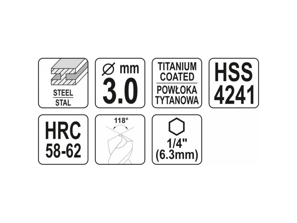 Yato YT-44820 fémmaró fúró. A marófúró magas minőségű, nagy sebességű, titánnal bevont HSS 4241 acélból készült. Szakmai, ipari alkalmazásokra szolgál. A STAL HSS többször gyorsabb fúrást tesz lehetővé rozsdamentes, saválló és szerkezeti acélban. A "Split Point" keresztpengével, 118°-os csúcsszöggel történő fúrás előzetes bemetszés nélkül is lehetséges, nagy fúrási átmérőknél is, tökéletes középre helyezést garantálva. Lehetővé teszik a fúrást minden irányban és bármely szögben, tökéletesek lyukak fúrására, beleértve az ajtózárakat is. A csiszolt felület kiváló fúrási pontosságot biztosít. Egy acéldarabból készülnek, így rendkívül erősek és tartósak. A 58–62 HRC keménységű, titán-nitrid borítású bevonat ellenáll a sérüléseknek és a nyúlásnak, megőrzi a fúrási geometriát • Alacsony fúrási hőmérséklet és gyors hőleadás nem okoz cinkbevonat olvadását és a fúrók korrózióját • A kisebb súrlódási tényező korlátozza a forgácsokhoz és reszelékekhez való tapadást. 1/4 ″ hatszögű nyél (6,3 mm).