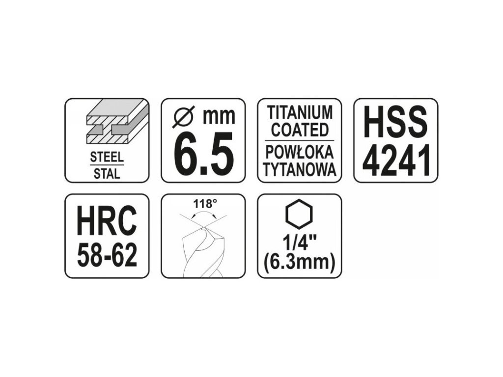 6.5 mm-es Yato YT-44824 fém marófurat. A marófurat magas minőségű, nagy sebességű HSS 4241 titán-bevonatú acélból készült. Professzionális, ipari alkalmazásokra szánt. A HSS STAL többször gyorsabb furatot biztosít szénacélban, saválló és szerkezeti acélban. A "Split Point" keresztélű pengével, 118°-os csúcsszögű, előzetes jelölés nélküli furásra alkalmas, nagy furatátmérő esetén is, tökéletes középpontozást garantál. Lehetővé teszi a furást minden irányban és bármely szögben, tökéletes furatok fúrásához, beleértve az ajtózárakat is. A csiszolt felület kiváló furatpontosságot biztosít. Egy darab acélból készült, ezért ők nagyon erős és tartós. A 58–62 HRC kemény bevonat, titán-nitriddel bevont, ellenáll a sérüléseknek és nyújtásnak, megőrizve a fúrási geometriát • Az alacsony fúrási hőmérséklet és a gyors hőelvezetés nem okoz cink beolvadását és a furatok későbbi korrózióját • A kisebb súrlódási tényező korlátozza a forgácsokhoz és reszelékekhez való tapadást. 1/4 ″ hatszögletű nyél (6.3 mm).