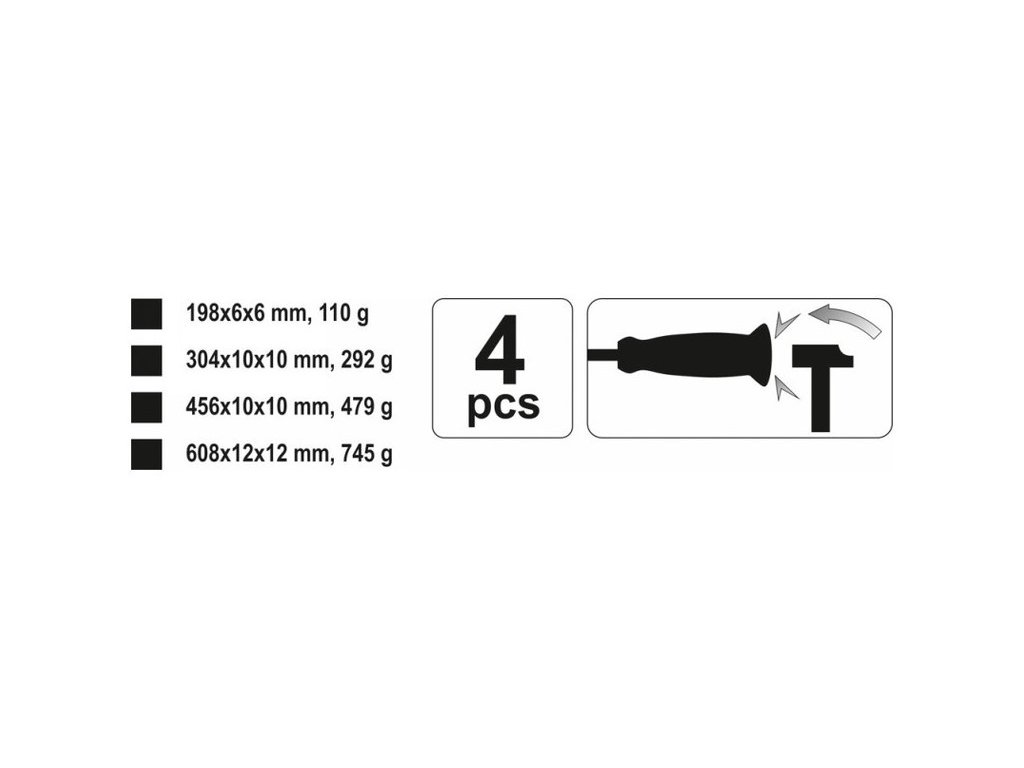 • Rozmery: 198X6X6 mm 304X10X10 mm 450X35X6 mm 608X12X12 mm • Rukoväť: pohodlný plastový kryt