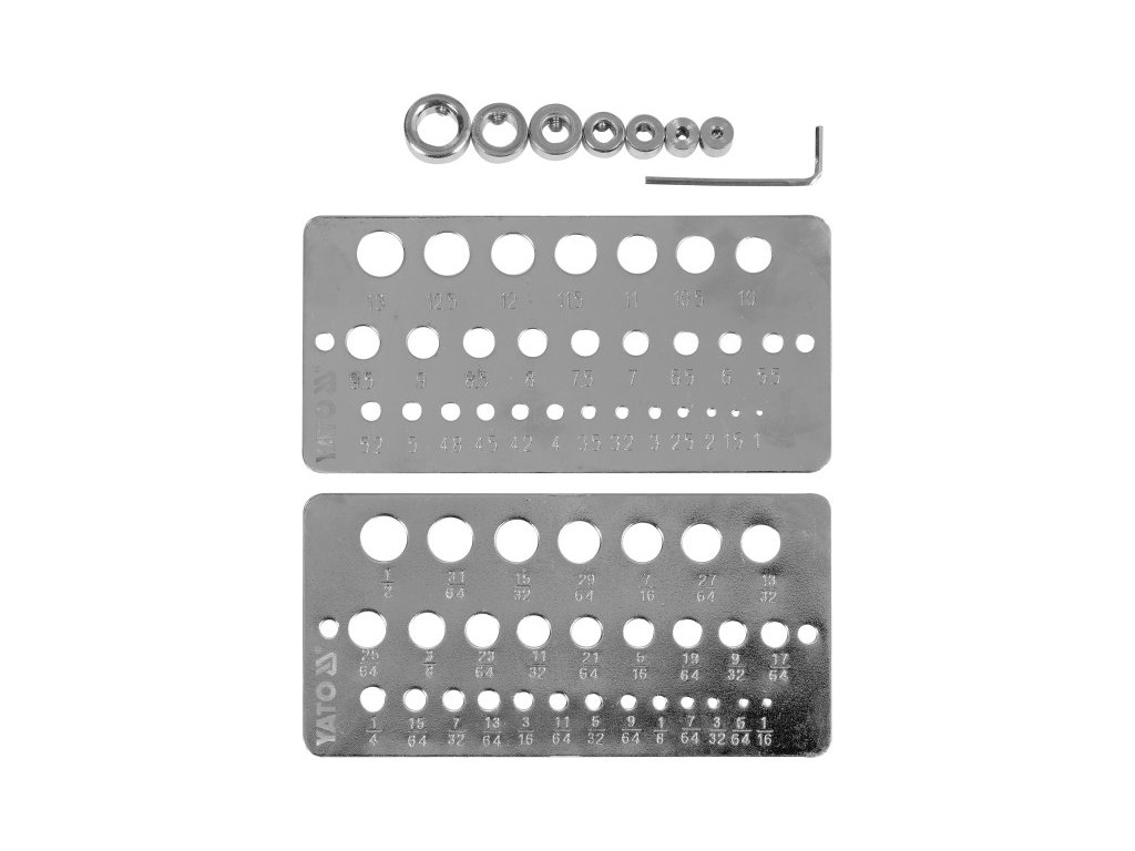 A készletben fúrásmélység-stopokat talál - forgácsolt, acélból készült, rögzítőcsavarral, 3 / 4 / 5 / 6 / 8 / 10 / 12 mm és egy 1,5 mm-es imbuszkulccsal. A mérőkészülékeket külső átmérők gyors, elsődleges ellenőrzésére használják /pl. fúrók, tengelyek, rudak, drótok stb. A mérőkészülékeket külső átmérők gyors, elsődleges ellenőrzésére használják /pl. fúrók, tengelyek, rudak, drótok stb. A gyűrű formájú fúrásmélység-stopok, amikor a fúróra helyezzük, lehetővé teszik a fúrt lyuk mélységének precíz ellenőrzését. A stopokat a fúróra helyezzük, meghatározzuk a megfelelő fúrásmélységet / a gyűrűt a fúrón kell zárolni / Ellenőrizzük a tesztdarab átmérőjét / pl. szög, rúd, tengely / olyan lyukba helyezzük, amelyben minimális játékkal mozgatható. Az átmérő a lyuk mellett a lemezen található. A készlet tartalmaz két ellenőrző lemezt és fúrásmélység-stopokat - forgácsolt, acélból készült, rögzítőcsavarral, 3 / 4 / 5 / 6 / 8 / 10 / 12 mm és egy 1,5 mm-es imbuszkulccsal.