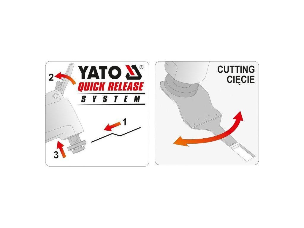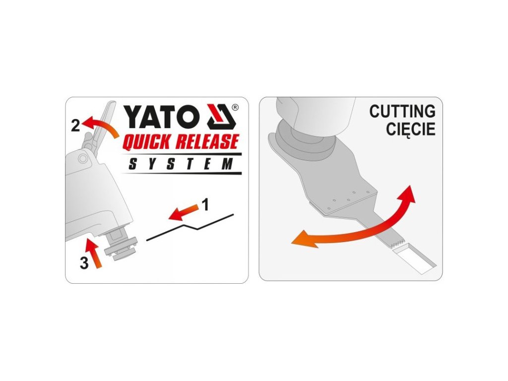 Ez a kiegészítő az oszcilláló multifunkciós szerszámhoz kemény anyagok, mint a fém vagy a kemény fa mély vágására szolgál. A YATO QUICK RELEASE SYSTEM sorozatú oszcilláló multifunkciós szerszámok és kiegészítők lehetővé teszik a kiegészítők gyors, ugrásmentes cseréjét, ami jelentősen megkönnyíti és felgyorsítja a munkát. A YATO QUICK RELEASE SYSTEM kiegészítők a legjobban a kompatibilis YATO eszközökkel működnek, különösen az YT-82220-as modellel. Ezenkívül a YATO QUICK RESLASE SYSTEM kiegészítők kompatibilisek a piacon elérhető legtöbb eszközzel, különösen a Bosch OIS rendszerrel kompatibilis eszközökkel. A YATO QUICK RELEASE System kiegészítők még a hagyományos rögzítési módszerrel, az Allen csavar meglazítása után is megkönnyítik a munkát, mert nem a teljes kicsavarása után, hanem már a csavar meglazítása után is rögzíthetők, ellentétben a versenytársak kiegészítőivel. Az oszcilláló multifunkciós szerszámok a leguniverzálisabb eszközök a piacon. A széles körű YATO kiegészítők használatával vághatók, mélyen vághatók, csiszolhatók, eltávolíthatók a habarcsok és ragasztók, lekaparhatók a festékbevonatok és olyan helyeken is dolgozhatnak, ahova más eszközökkel nem lehet elérni. Mindezt a nagyfrekvenciás kiegészítők oszcillációinak köszönhetően érjük el, aminek köszönhetően teljes kontrollt tartunk a szerszám felett (nincs "visszarúgás" hatás, ami a forgóvágásra jellemző) és minimális rezgéssel. Az multifunkciós szerszámok esetében a felszerelés határozza meg az eszköz hasznosságát. Kibővíti annak képességeit, de a kiegészítők minősége is a legnagyobb hatással van az eszközök munkahatékonyságára. A kényelem is nagyon fontos, minden eszközhasználó értékelni fogja ezt a funkciót, amely lehetővé teszi a kiegészítők hirtelen cseréjét.