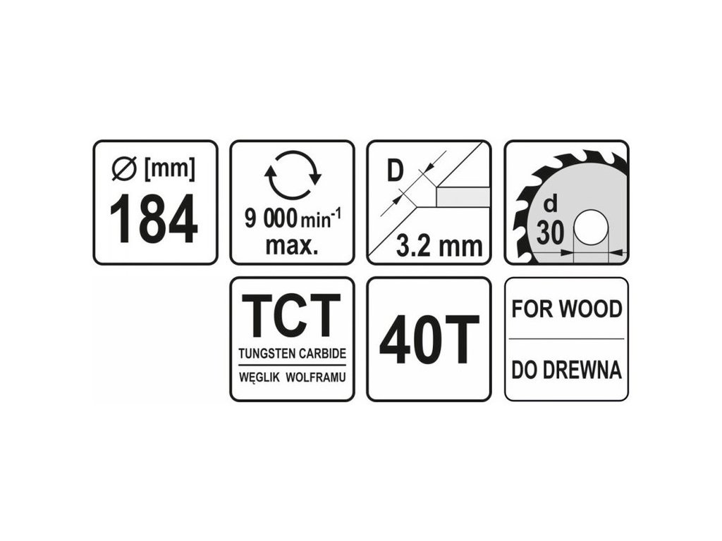 Pílový kotúč na drevo, ktorý možno použiť s väčšinou píl a pokosových píl na trhu Technické údaje Veľkosť (mm) 184x30x2,2 mm Počet zubov píly 40 Otáčky (ot./min) 9500 Oblasť použitia drevo