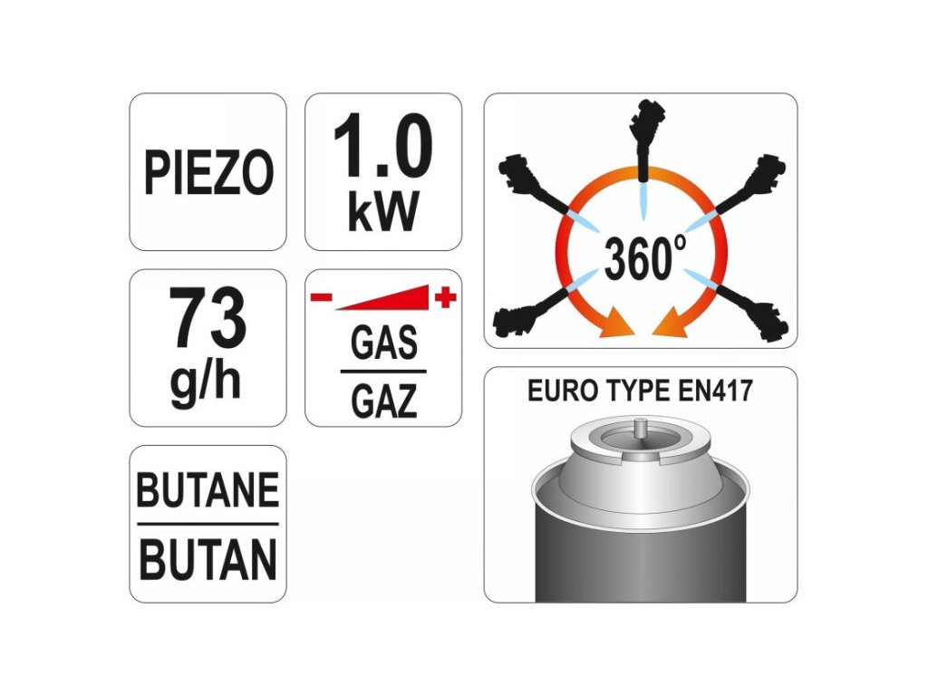 Működése propan-bután gázzal történik, amelyet külső hengerből vesz fel EN417 csatlakozóval, a gázégő teljesítménye 1,0 kW, ezzel eléri a 1000º C maximális hőmérsékletet. A gázfogyasztása 73g/h.