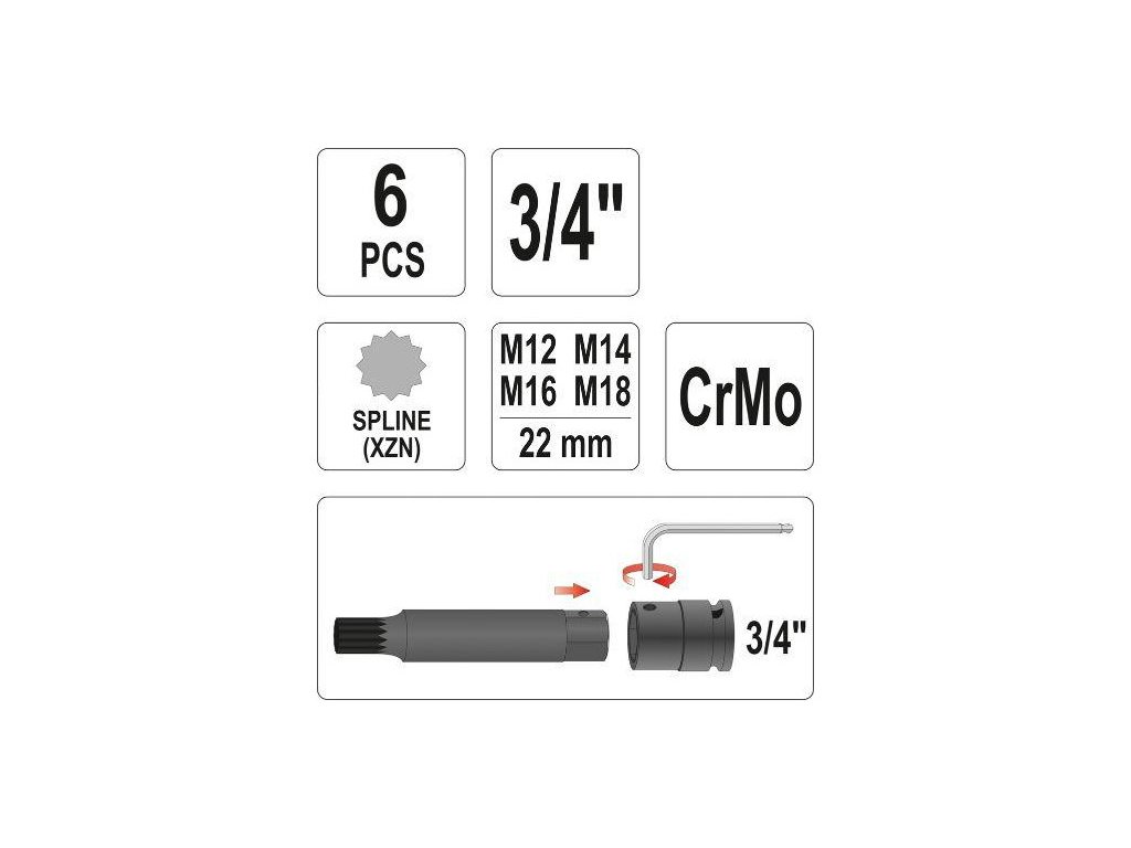 • 3/4 palca: 22 mm • Drážka: M12, M14, M16, M18 • Dĺžka: 107 mm • Materiál: CrMo