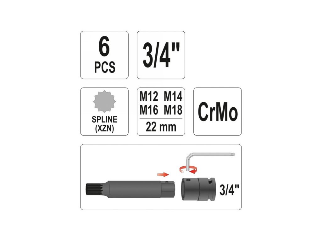 Sada nadstavcov 3/4” rázové 6 ks M12-M18 viaczubé CrMo