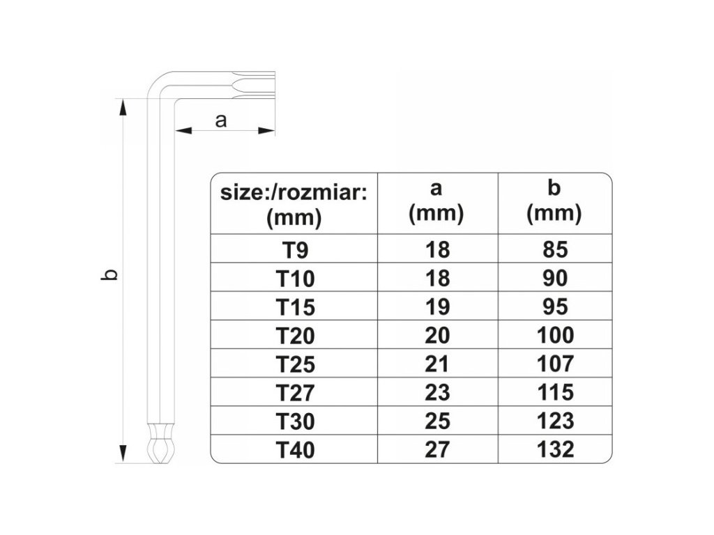 • T9 18x85 mm • T10 18x90 mm • T15 19x95 mm • T20 20x100 mm • T25 21x107 mm • T27 23x115 mm • T30 25x123 mm • T40 27x132 mm • CrV
