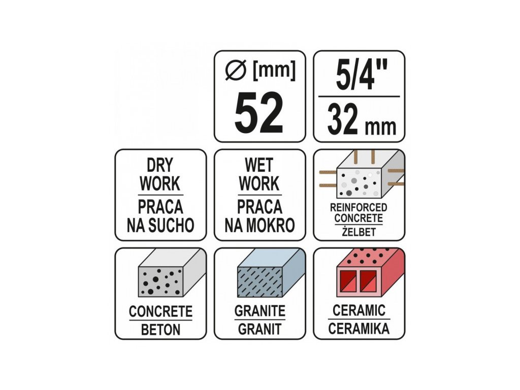 YATO koronafúró fúróállványhoz kialakítva nem kalapács működésre - száraz és nedves – fúróállvánnyal (például YT-81980). Lehetővé teszi a gyors és precíz lyukfúrást, akár állvány nélkül is, betonban, silikátban, például elektromos dobozok alatt, mennyezetek fúrása csövek és kábelek számára, kábelutak vagy szellőzőcsatornák telepítése.