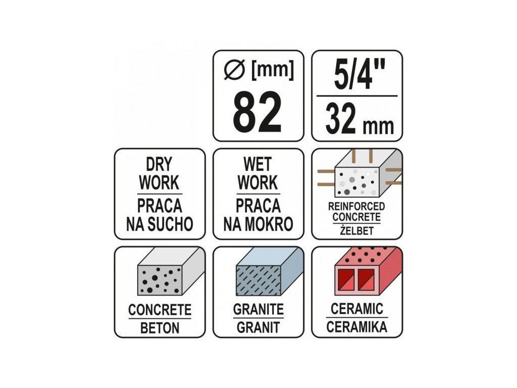 YATO koronafúró fúróállványhoz tervezve nem ütőműködéshez – száraz és nedves – fúróállvánnyal (például YT-81980). Lehetővé teszi gyors és pontos lyukak fúrását, még állvány nélkül is, betonba, szilikátba, mint például elektromos dobozok alá, mennyezetek fúrása csövekhez és kábelekhez, kábelútvonalak vagy szellőzőcsövek felszereléséhez.