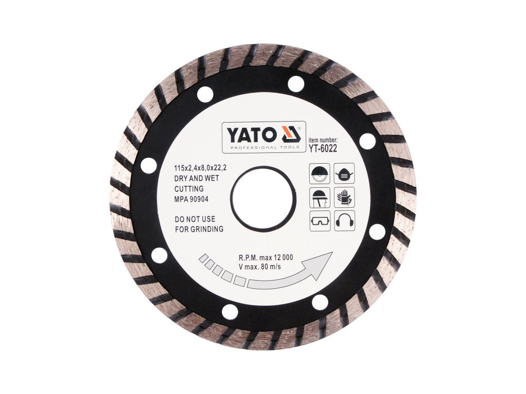 Diamantový rezací kotúč so špeciálnou turbo hranou, ktorej takmer súvislá hrana bola vyvinutá na rezanie kameninových dlaždíc Kotúč umožňuje veľmi jemné, presné rezanie, je vhodné len na priame rezanie priemerov (115, 125 mm), možno ho použiť aj nasucho, ale pri veľkostiach väčších ako 125 mm je vodné chladenie bezpodmienečne nutné. Vystužené oceľové základné telo zaisťuje stabilný, rovnomerný rez a kotúč sa nedeformuje ani nezlomí používa správne Použiteľnosť: Mokré rezanie Suché rezanie Stroj na rezanie dlaždíc s horným vedením Stroj na rezanie dlaždíc so spodným vedením Uhlová brúska na rezanie Technické údaje Oblasť použitia betón, železobetón, tehla, dlaždice, murivo, kameň, pieskovec Rozmer (mm) 115 x 2,4 x 8,0 x 22,2 Rezná hrana Turbo Otáčky (ot./min.) 12000 Priemer (mm) 115