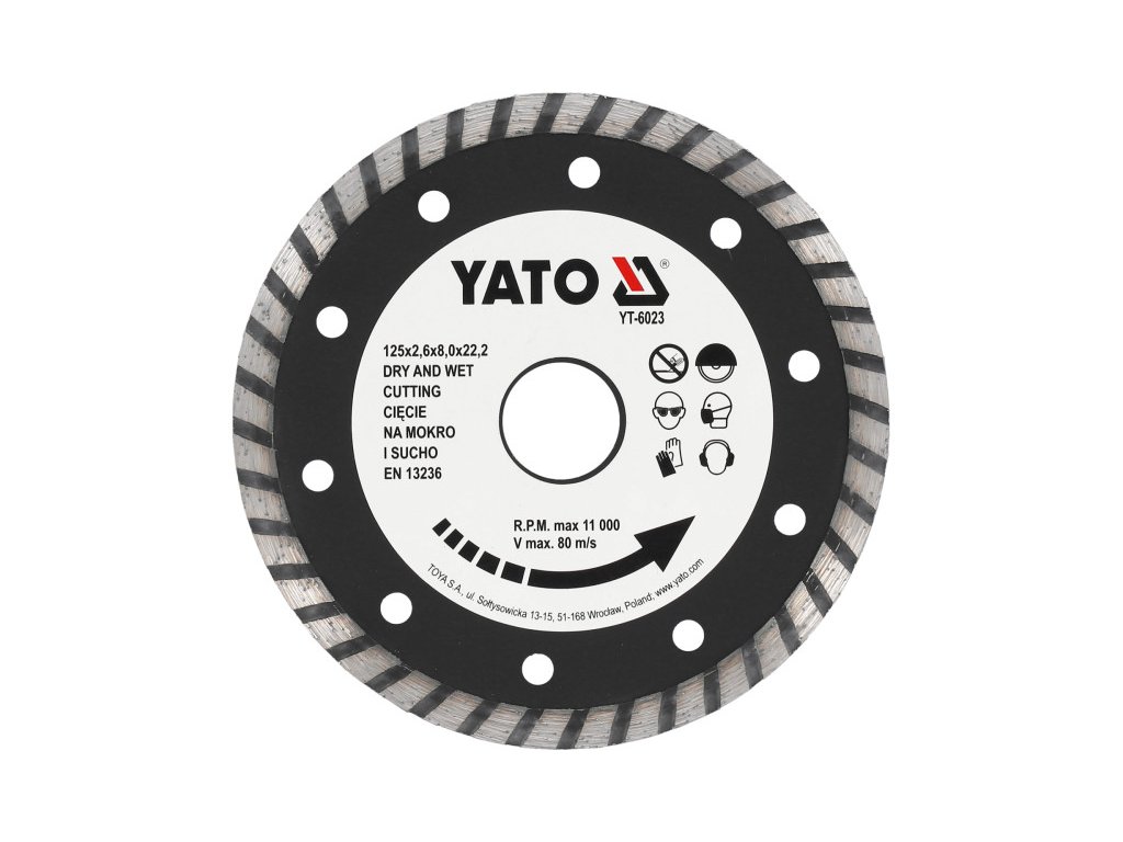 Diamantový rezací kotúč so špeciálnou turbo hranou, ktorej takmer súvislá hrana bola vyvinutá na rezanie kameninových dlaždíc Kotúč umožňuje veľmi jemné, presné rezanie, je vhodné len na priame rezanie priemerov (115, 125 mm), možno ho použiť aj nasucho, ale pri veľkostiach väčších ako 125 mm je vodné chladenie bezpodmienečne nutné. Vystužené oceľové základné telo zaisťuje stabilný, rovnomerný rez a kotúč sa nedeformuje ani nezlomí používa správne Použiteľnosť: Mokré rezanie Suché rezanie Stroj na rezanie dlaždíc s horným vedením Stroj na rezanie dlaždíc so spodným vedením Uhlová brúska na rezanie Technické údaje Oblasť použitia betón, železobetón, tehla, dlaždice, murivo, kameň, pieskovec Rozmer (mm) 125 x 2,6 x 8,0 x 22,2 Rezná hrana Turbo Otáčky (ot./min.) 11000 Priemer (mm) 125