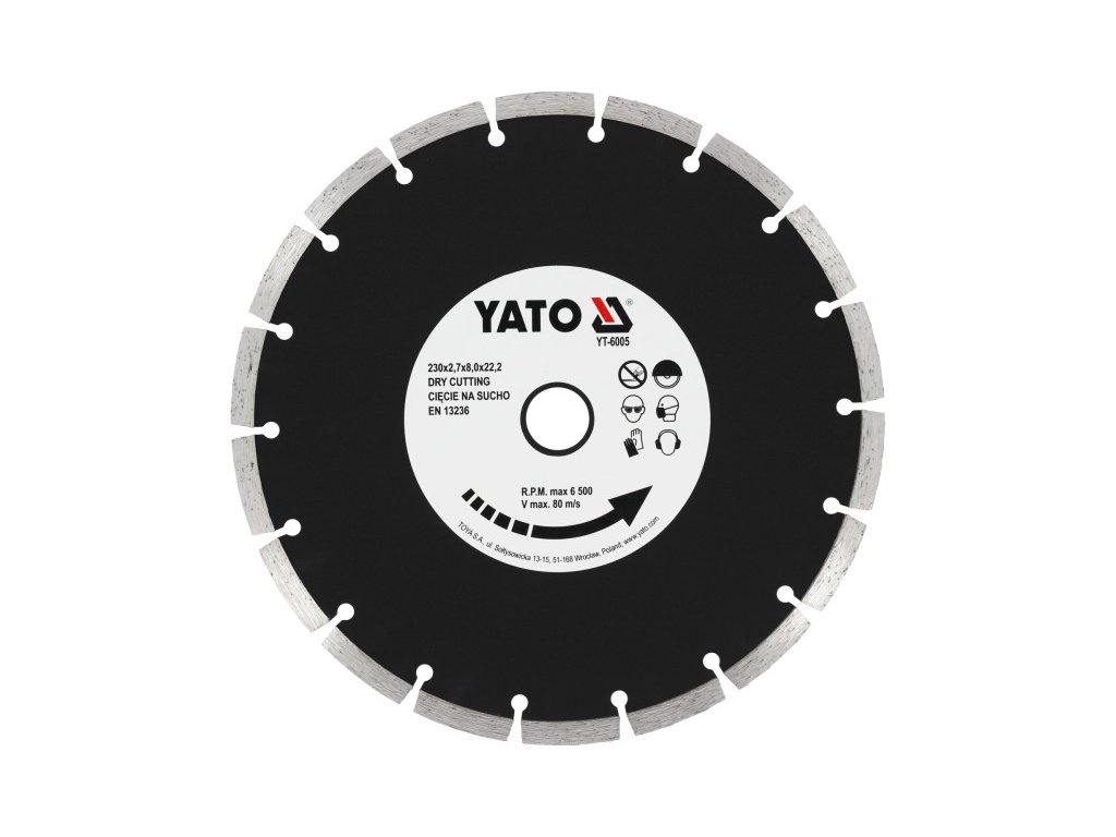 Vysokokvalitný diamantový rezací kotúč určený pre profesionálne použitie v stavebníctve, remeslách a dokončovacích prácach Stabilná, odolná konštrukcia - kovový kotúč s diamantovými reznými segmentmi Ekonomické použitie Určený na rezanie betónu, tehál, prírodného a umelého kameňa, iných stavebných materiálov Určený na opracovanie s uhlovými brúskami Na rezanie za sucha Technické údaje Oblasť použitia betón, žula Veľkosť (mm) 230 x 2,7 x 8,0 x 22,2 Rezná hrana segmentovaná Otáčky (ot./min) 6500 Priemer (mm) 230