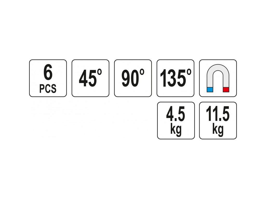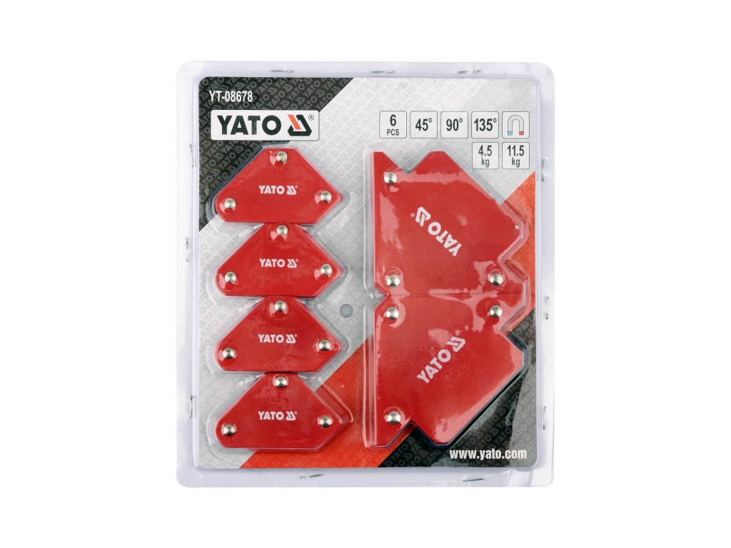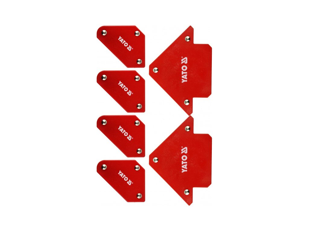 6-os mágneses hegesztési szögkészlet YT-08678, acéllemezből és erős ferritmágnesekből készült. Porbevonatos felület. Fémalkatrészek ideiglenes összekapcsolására szolgál hegesztés, fúrás, festés során.