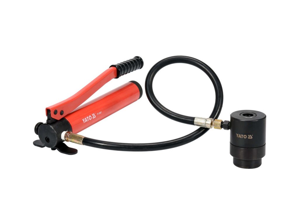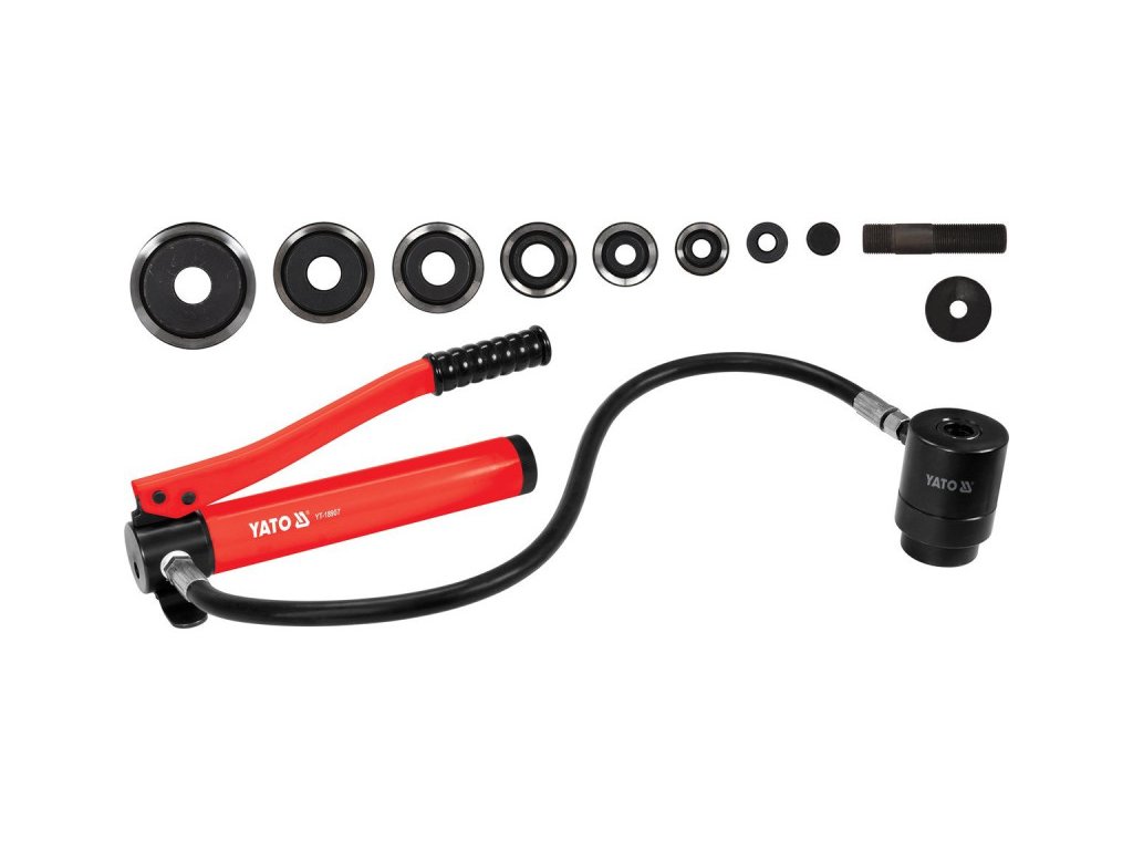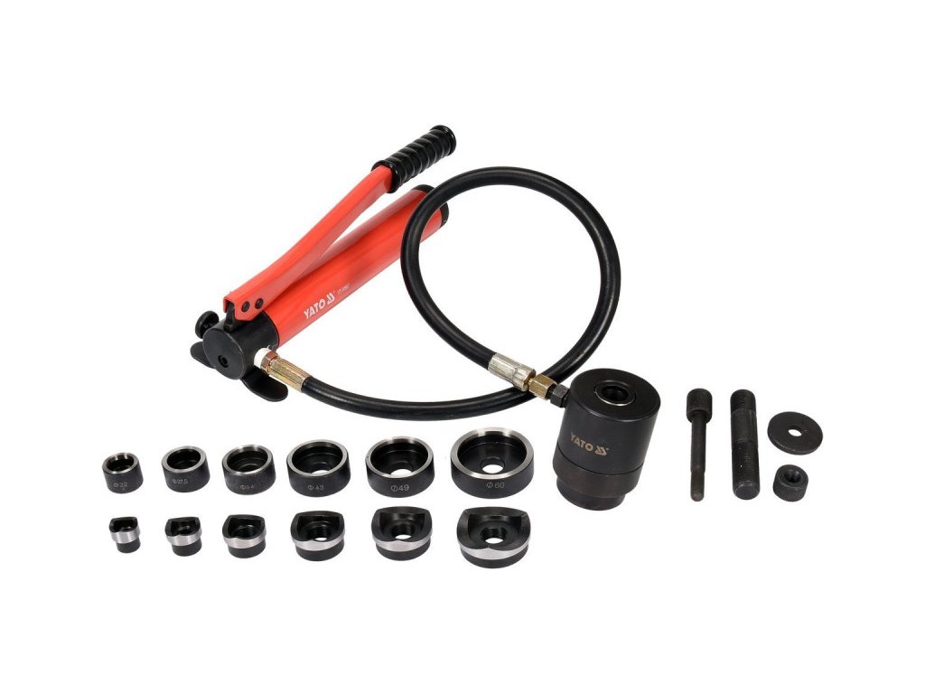 Készlet 22-60 mm átmérőjű kerek lyukak vágására lemezekben. A vágófej hidraulikus hengeres pumpával csatlakozik egy tömlőhöz. A készletet kapcsolószekrények gyártásánál használják lyukak vágására, például dobozok vagy kapcsolók felszereléséhez. A lyukak vágásakor a lemez felülete nem deformálódik és nem sérül. A készlet könnyen szállítható és tárolható - egy strapabíró bőröndben van csomagolva. Matricákat és vágóeszközöket tartalmaz 22 mm/0,9 ", 27,5 mm/1,1", 34 mm/1,3 ", 43 mm/1,7", 49 mm/2,0 ", 60 mm/2,4" átmérőjű lyukak vágásához. A vágás során az anyagra gyakorolt nyomás mintegy 6 tonna. Alkalmas acéllemezek, rozsdamentes lemezek és színesfémek lyukainak vágására. A vágott anyag vastagsága annak típusától függően akár 4 mm is lehet. A készlet tartalmaz 6 darab vágószerszámot Fi 22, 27,5, 34, 43, 49, 60 mm méretekben, 2 db rögzítő párnát 7/16x3/4 inch és 3/4x3/4 inch méretekben, kézi hengert egy kígyóval, 1 tömítési készletet. Gyors vágásra alkalmas nagy, precíz lyukak vágásához 22-60 mm átmérőben. A felhasználói utasítások szerint a pumpával és a tömlővel, a 22 mm/0,9 ", 27.5 mm/1.1", 34 mm/1.3 ", 43 mm/1.7", 49 mm/2.0 ", 60 mm/2.4" átmérőjű vágó bélyegekkel, a 22 mm/0.9", 27.5 mm/1.1 "bélyegekhez megfelelő átmérőjű matricákkal, 34 mm /1.3 ", 43 mm/1.7", 49 mm/2.0 ", 60 mm/2.4" rögzítő mandulákkal 7/16x3/4 inch és 3/4x3/4 inch méretű tömítési készlettel, amely egy bőröndben van csomagolva.