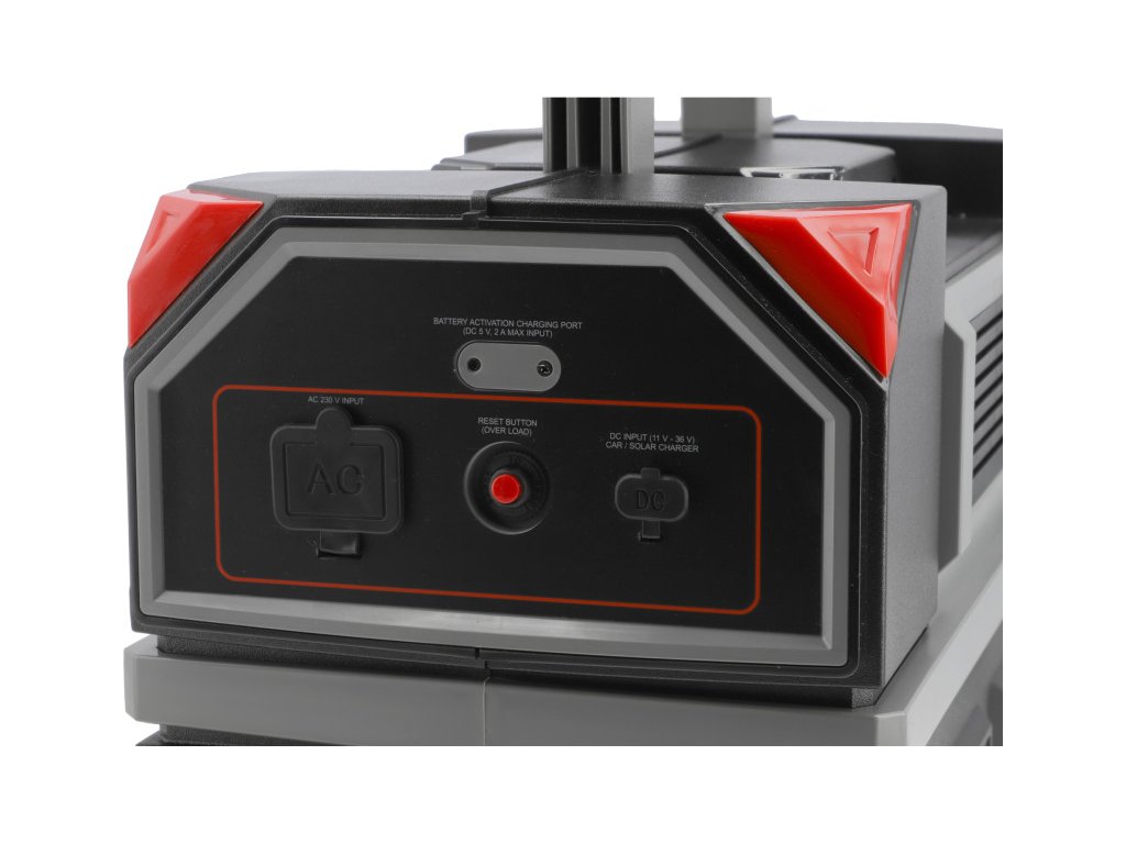 - az állomás töltése háromféleképpen lehetséges: egy kétirányú konverternek köszönhetően, gyorstöltés közvetlenül a hálózati aljzatból, kábel segítségével a cigarettagyújtóból vagy külső fotovillamos panelekből