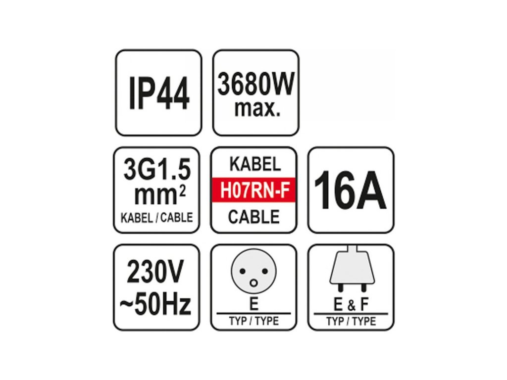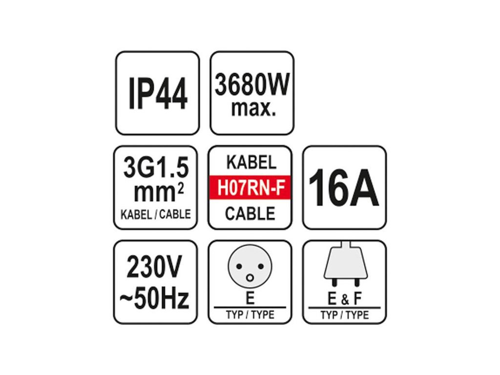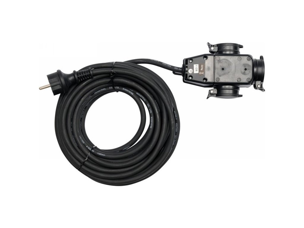 Építkezési és műhely hosszabbító kábel YT-81162 20 méter hosszú, elosztóval és 3 por- és fröccsenő vízálló aljzattal. A neoprén gumi bevonatú kábel a hosszabbítót beltéri és kültéri használatra is alkalmas, mint például építkezések, kertek, gyárudvarok. A hosszabbító kábel konstrukciója szerszámgépekkel történő használatra készült építkezéseken vagy műhelyekben.
