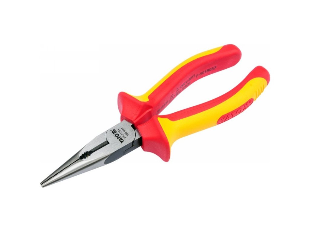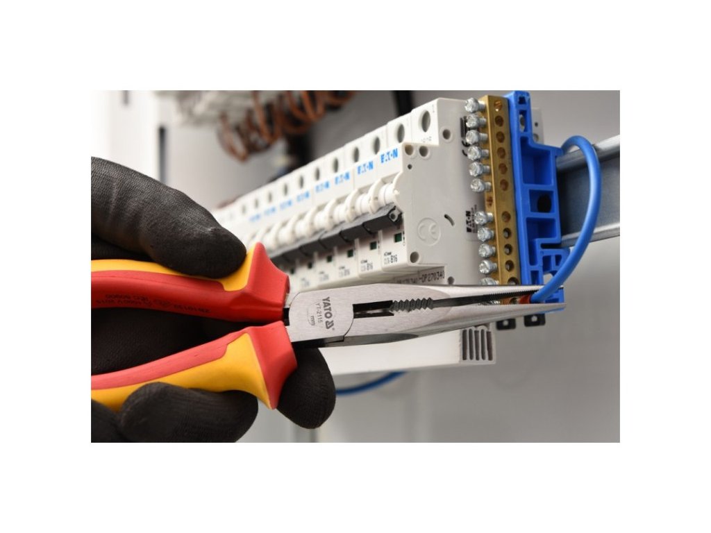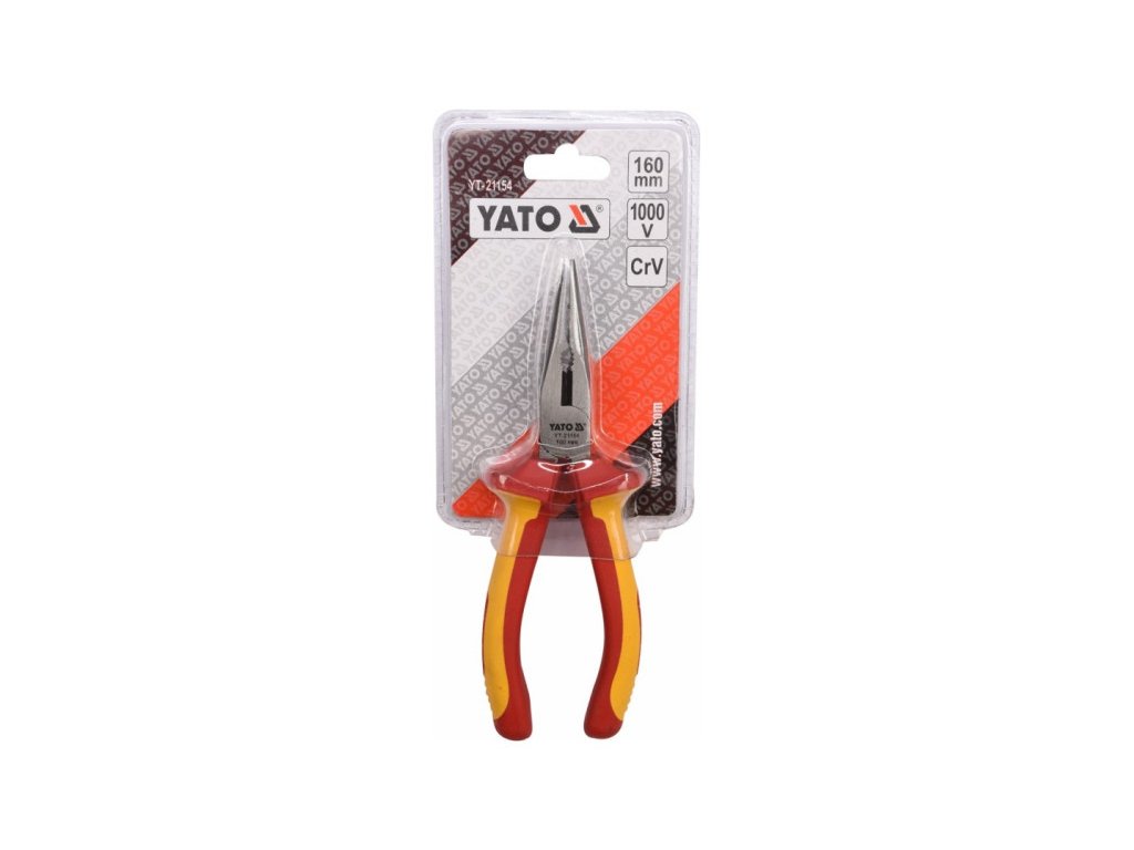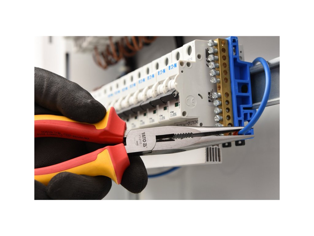 YT-21154 hosszú egyenes fogó VDE szigeteléssel, minőségi CrV acélból készült. Félkör alakú és csúcsos állkapocs profil rendkívül pontos hornyokkal és tartós vágóelemmel.