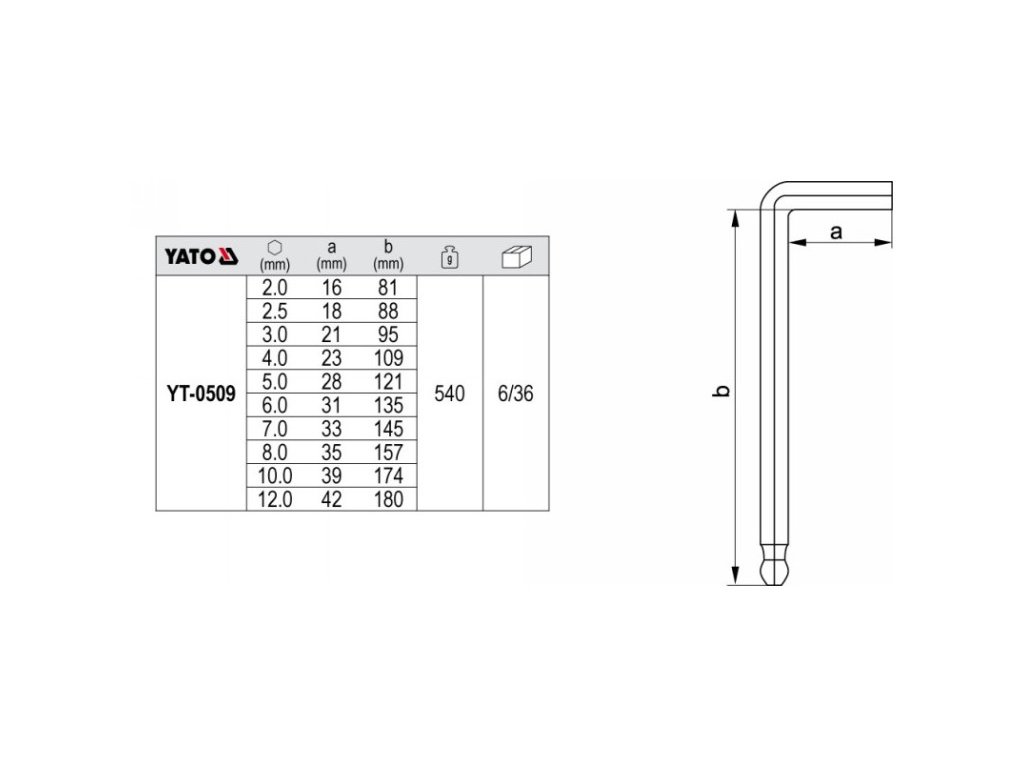 YATO súprava imbusových kľúčov 10 dielov 2,0-12 mm CrV