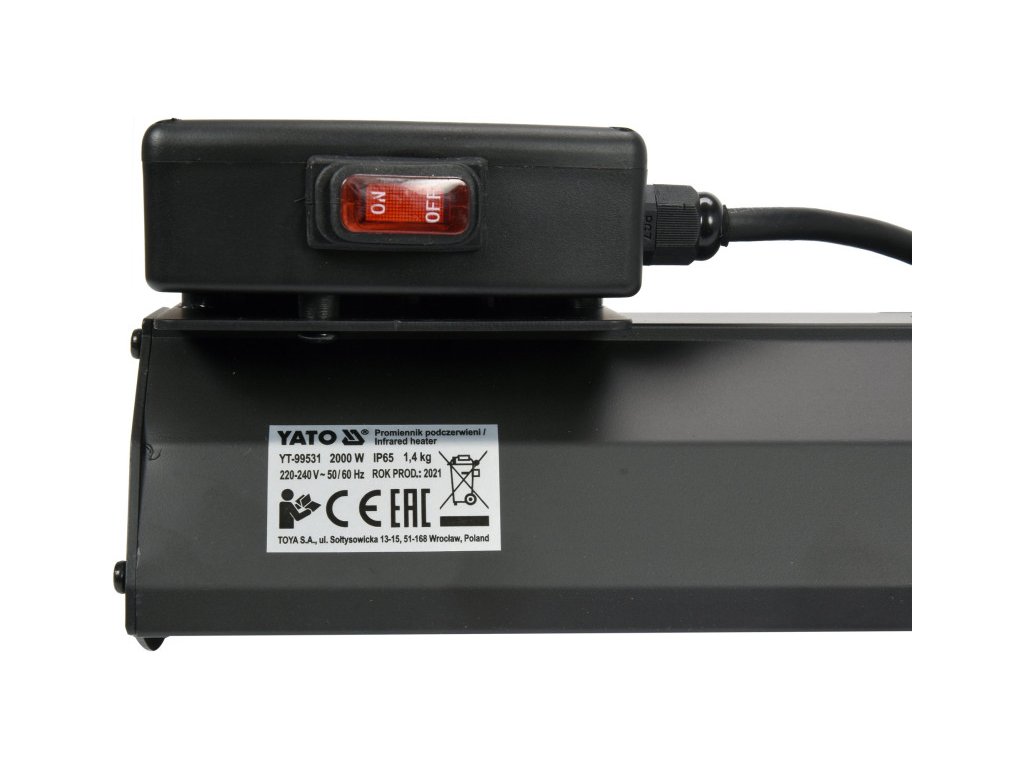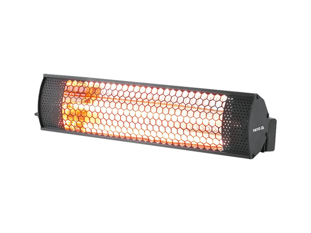 A Yato infravörös fűtőtest nagyszerű választás a munka- vagy pihenőterületed fűtésére hideg napokon és éjszakákon. Gyorsan melegedő arany halogén lámpával felszerelve, képes 12-18m2 terület felmelegítésére. Az IP65 védettségi fokozat lehetővé teszi a lámpa felszerelését olyan helyeken, amelyek ki vannak téve csapadéknak, mint például a terasz, pavilon, stb. A szerelési készlet lehetővé teszi a sugárzó lámpa falra, mennyezetre és Yato márka állványra történő felszerelését (YT-99570, YT-99571).