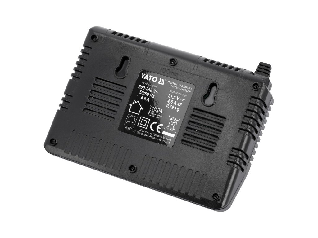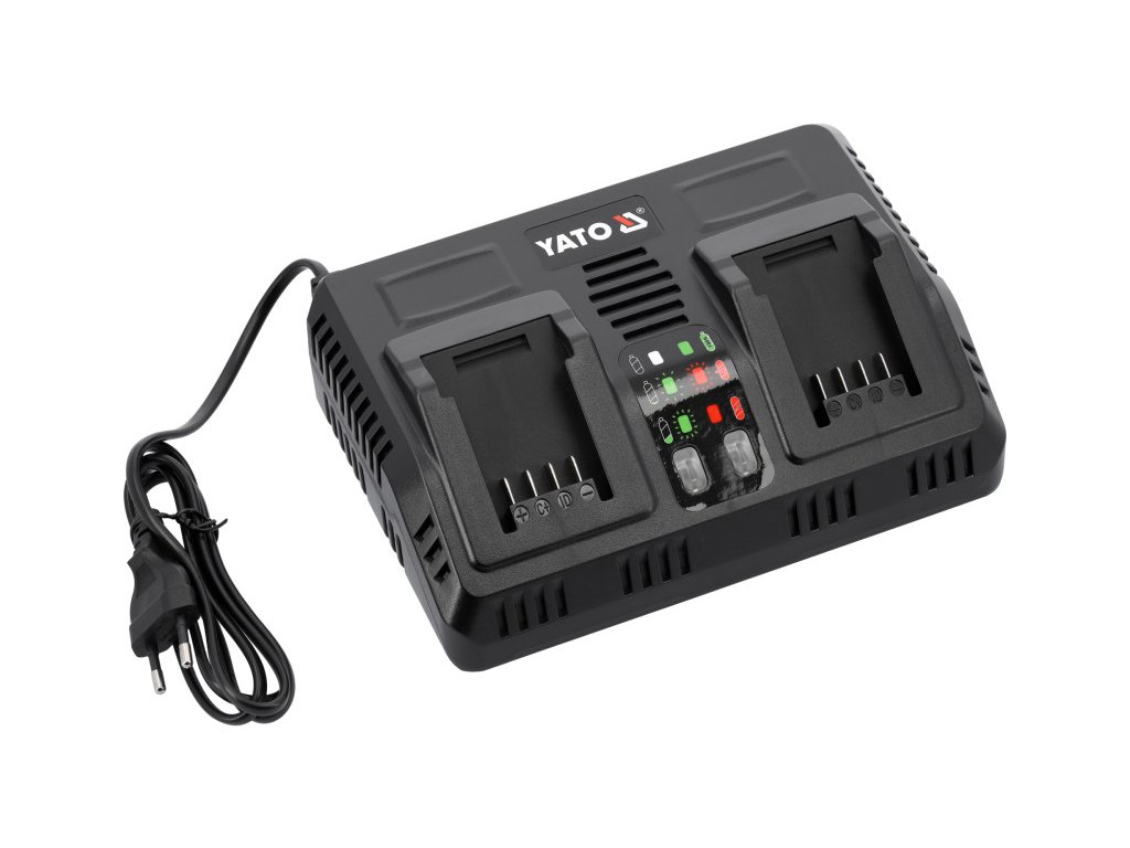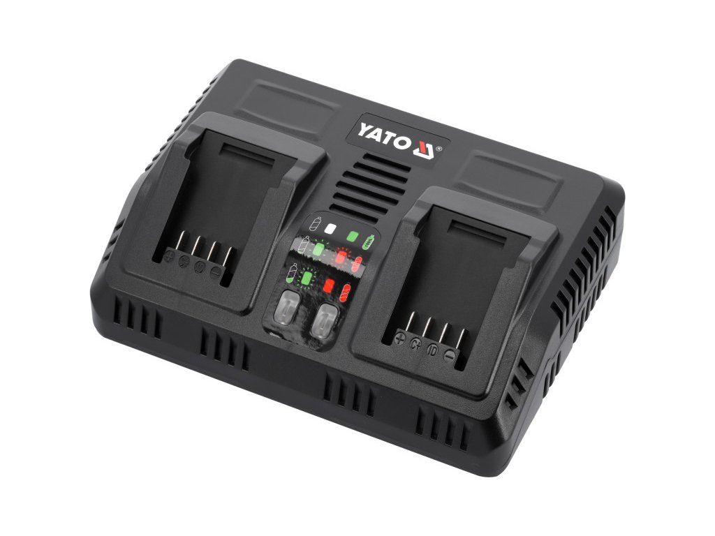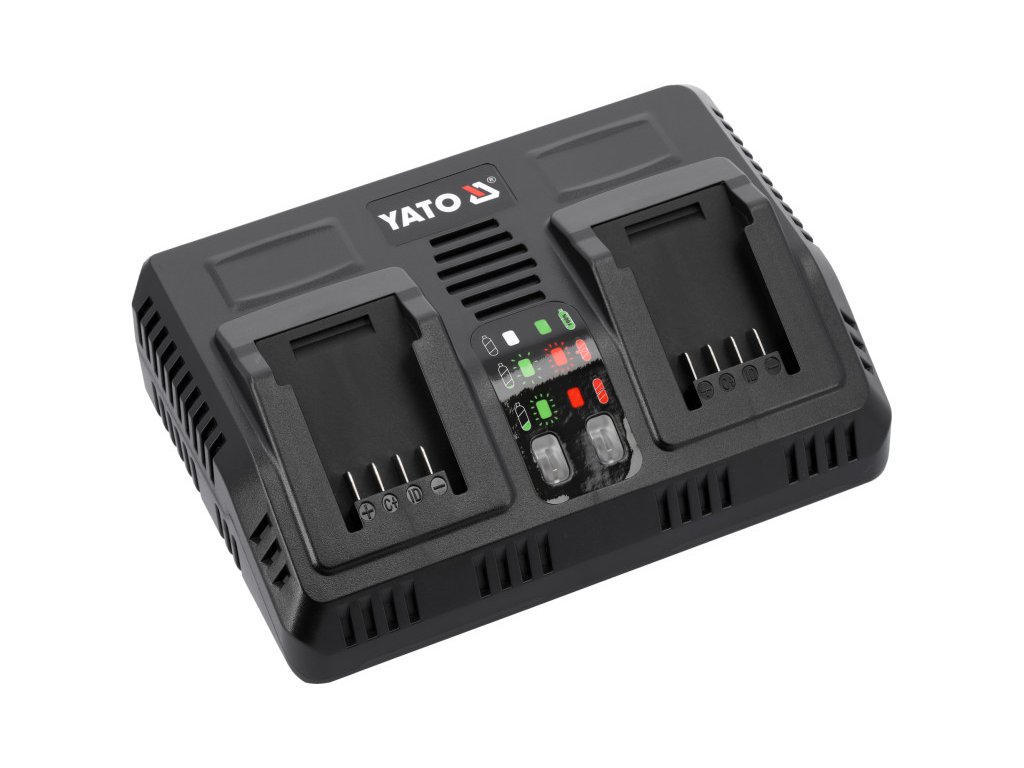 Gyors kettős töltő minden YATO 18-voltos rendszerű akkumulátorhoz. A beépített akkumulátor teljesítmény- és hőmérséklet-ellenőrző rendszer gondoskodik az akkumulátor élettartamáról. Nem kezd töltést, ha az elemek túl forrók. Negatív hőmérsékleten tárolt akkumulátor esetén akkor kezd töltést, amikor az akkumulátor hőmérséklete eléri a +5 Celsius-fokot.