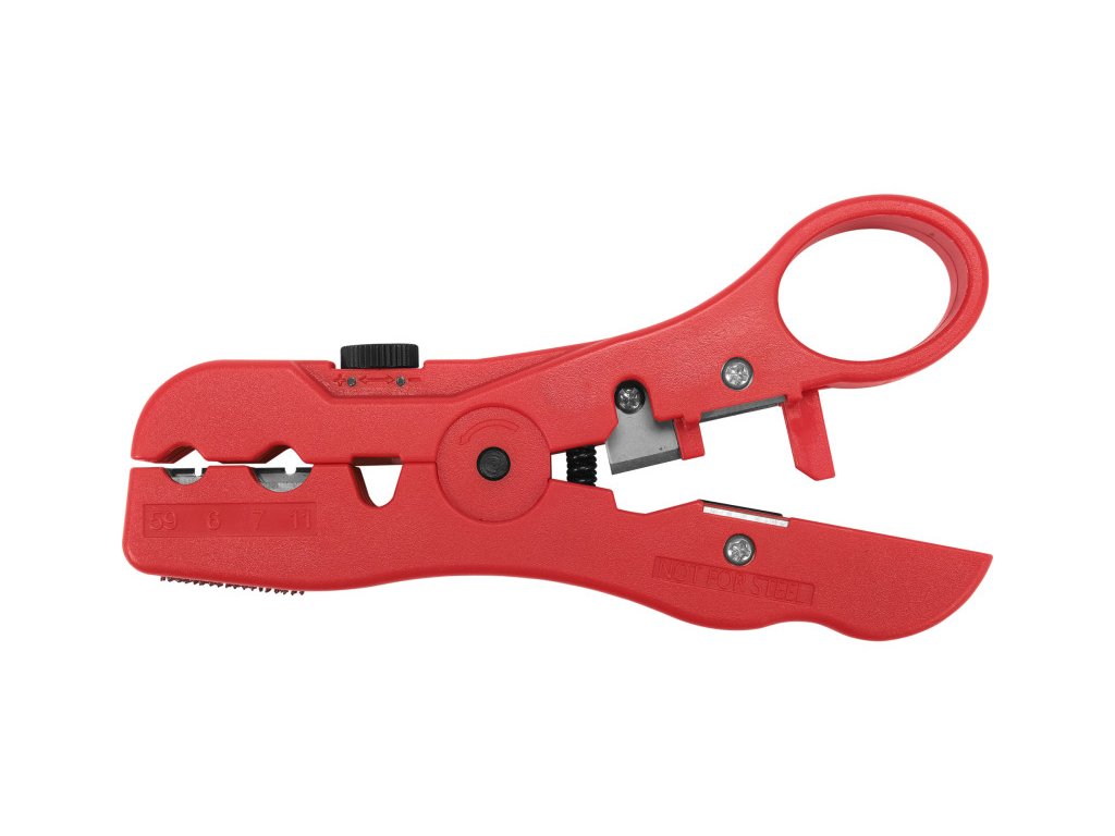 Slúži na rýchle odstránenie izolácie anténnych a sieťových káblov vyhradené odizolovacie polia pre anténne káble RG59, RG6, RG7, RG11 nastaviteľné pole na odizolovanie káblov STP/UTP možnosť odstrihnutia drôtov rezací prvok z tvrdenej ocele SK5, nástroj. karoséria ABS